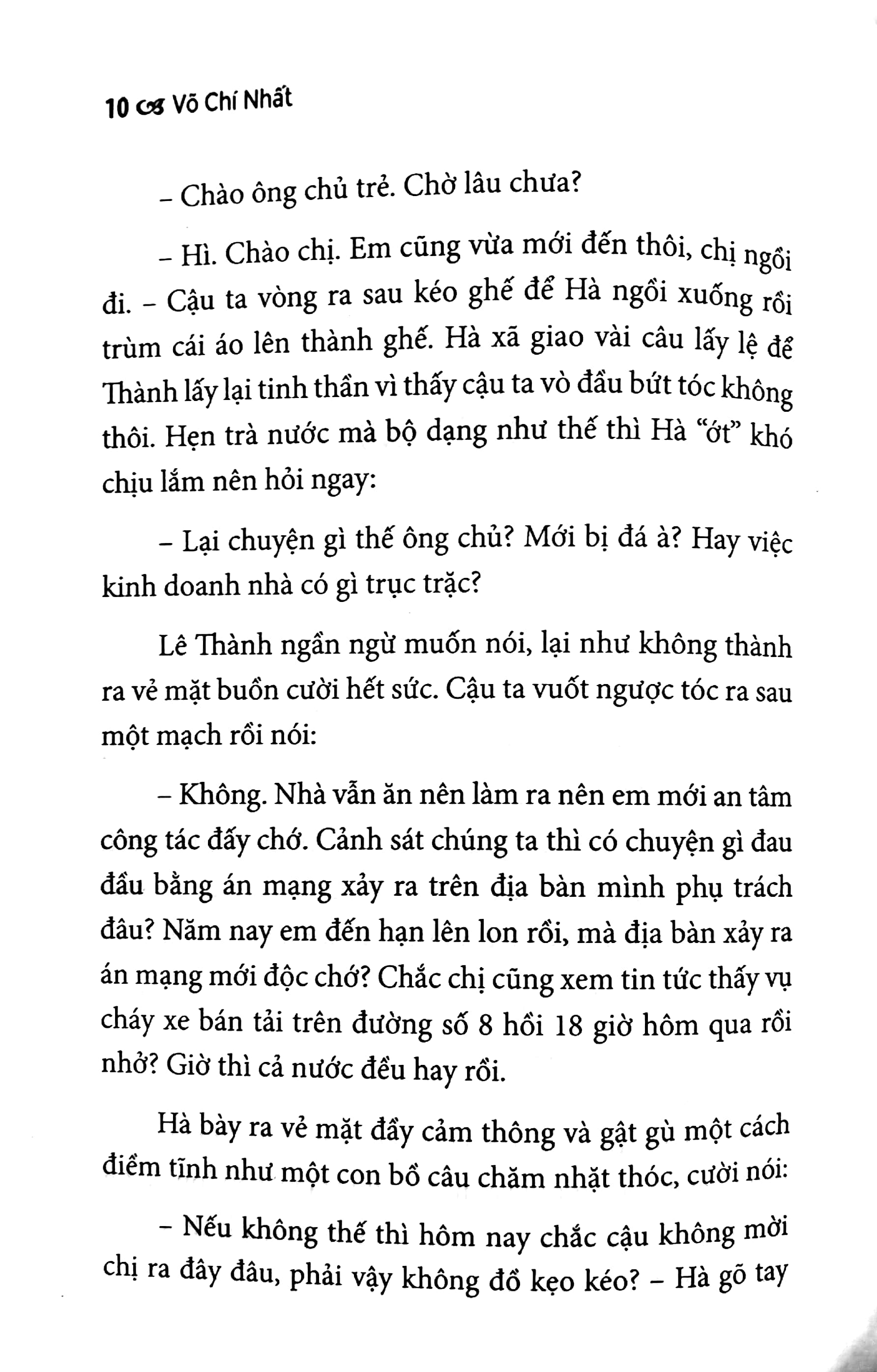 "Tinh tế nhiều kiểu phá 10 vụ án trong 10 truyện ngắn, chỉ dùng một nhân vật chính xuyên suốt là cô cảnh sát hình sự trẻ Hà "ớt”, nhà văn Võ Chí Nhất là "người xí trước” dùng "kiểu” Sherlock Holmes hay Thanh tra Maigret quen thuộc cho dòng văn chương trinh thám Việt Nam." - Nhà văn NGUYỄN THỊ NGỌC HẢI