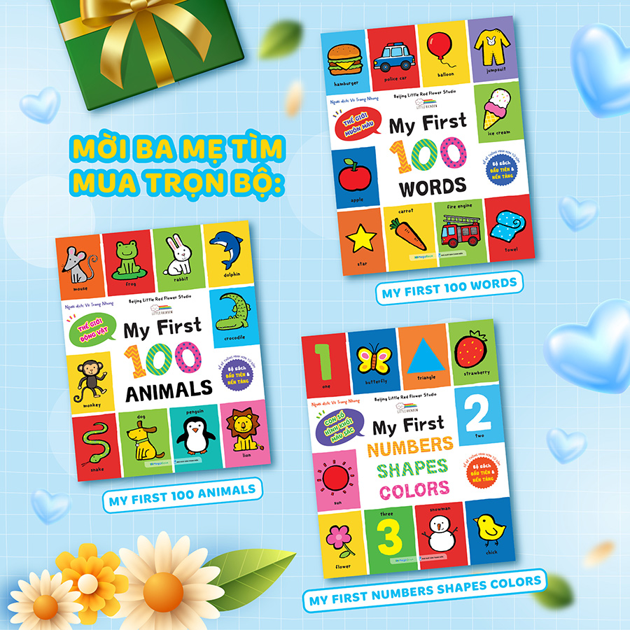 • Bộ sách gồm 3 cuốn: 100 con vật đầu tiên, 100 từ đầu tiên, từ đầu tiên về con số, hình dạng và màu sắc
