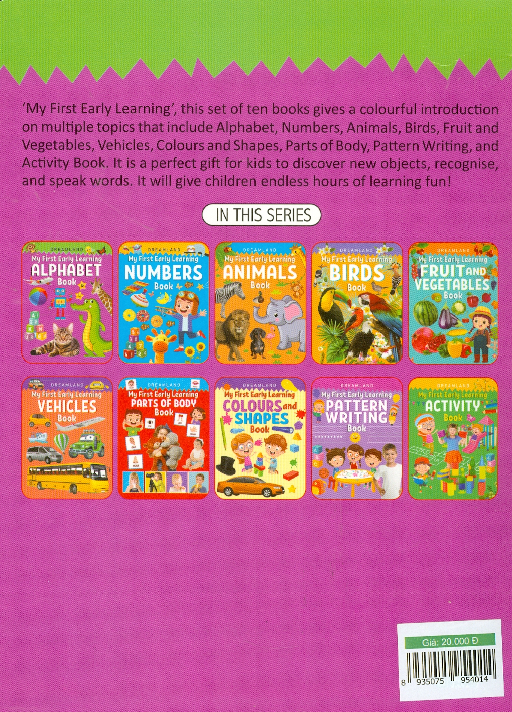 'My First Early Learning' gồm 10 cuốn sách:- Bảng chữ cái, Số, Động vật, Chim, Trái cây và Rau củ, Màu sắc và Hình dạng, Các bộ phận của Cơ thể, Viết theo Mẫu và Hoạt động. Bộ sách vui nhộn và mang tính giáo dục với những hình ảnh dễ thương sống động này là sự lựa chọn tốt nhất cho trẻ em.