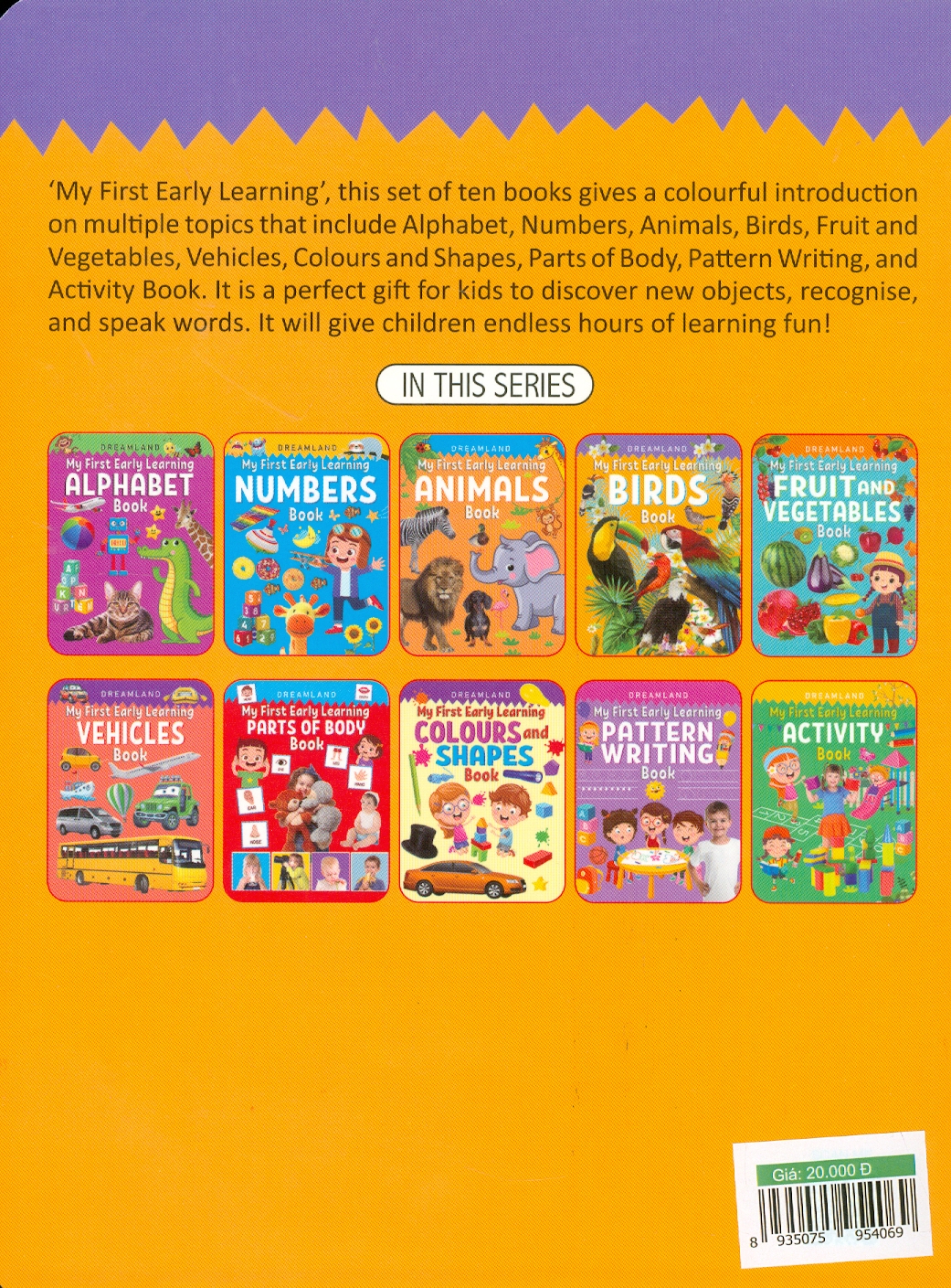 Mua tại Tiktok'My First Early Learning' gồm 10 cuốn sách:- Bảng chữ cái, Số, Động vật, Chim, Trái cây và Rau củ, Màu sắc và Hình dạng, Các bộ phận của Cơ thể, Viết theo Mẫu và Hoạt động. Bộ sách vui nhộn và mang tính giáo dục với những hình ảnh dễ thương sống động này là sự lựa chọn tốt nhất cho trẻ em.