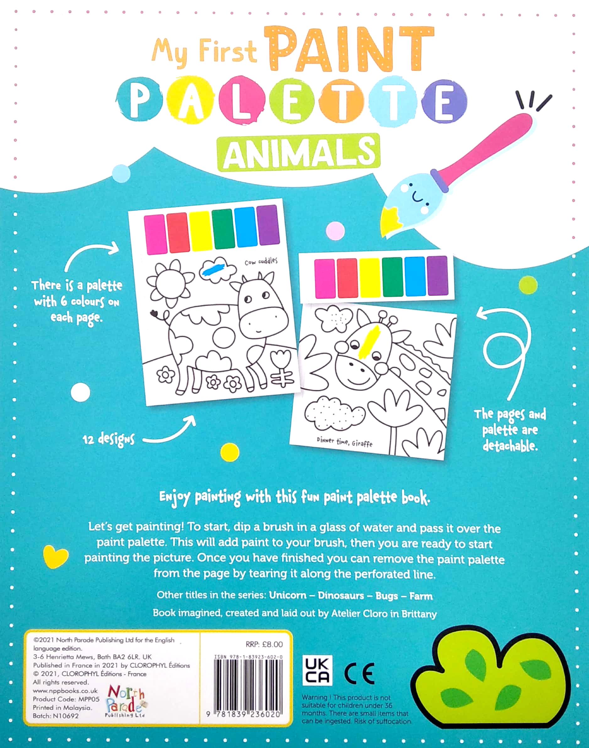 Let’s get painting! To start, dip a brush in a glass of water and pass it over the paint palette. This will add paint to the brush, then you are ready to start painting the picture. Once you have finished you can remove the paint palette from the page by tearing it along the perforated line.