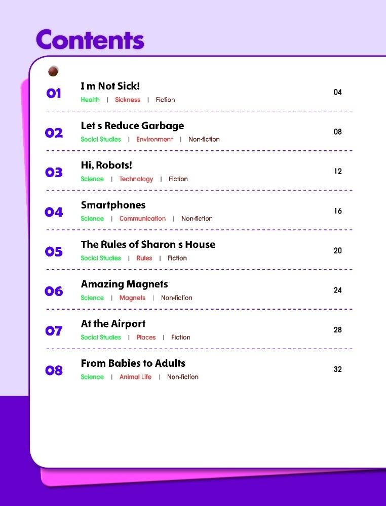My Next Reading is a six-level reading series for young learners, using school subjects (Science, Social studies, Art, etc.) related topics for writing sentences and speaking with partners.