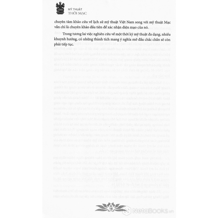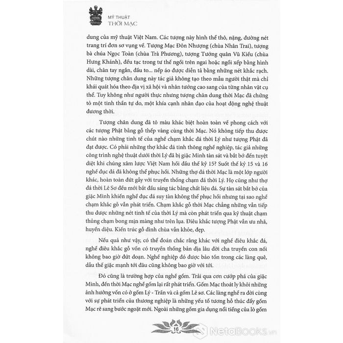 Mỹ Thuật Thời Mạc Để tiến tới biên soạn bộ lịch sử mỹ thuật Việt Nam, trong nhiều năm qua, Viện Mỹ thuật chúng tôi đã lần lượt tổ chức viết và cho công bố các tập Mỹ thuật thời Lý (1973), Mỹ thuật thời Trần (1977) Mỹ thuật thời Lê Sơ (1978) và Mỹ thuật Huế (1992). Nam trong chương trình chung đó, công trình Mỹ thuật thời Mạc cũng đã được hoàn thành bản thảo từ năm 1985. Nhưng vì nhiều lý do khác nhau, đến nay cuốn sách mới ra mắt bạn đọc được. Cũng như các tập trước, công trình Mỹ thuật thời Mạc là tập hợp các bài viết về nghệ thuật kiến trúc, điêu khắc, trang trí và gốm mà tác giả là những cán bộ của Viện. Mở đầu là một bài viết khái quát về mỹ thuật thời Mạc. Tác giả đưa ra những nhận định, đánh giá chung về nền mỹ thuật, thời này cũng như qủa trình nhận diện và định vị nó trong lịch sử mỹ thuật. Tiếp theo là phần viết về nghệ thuậ