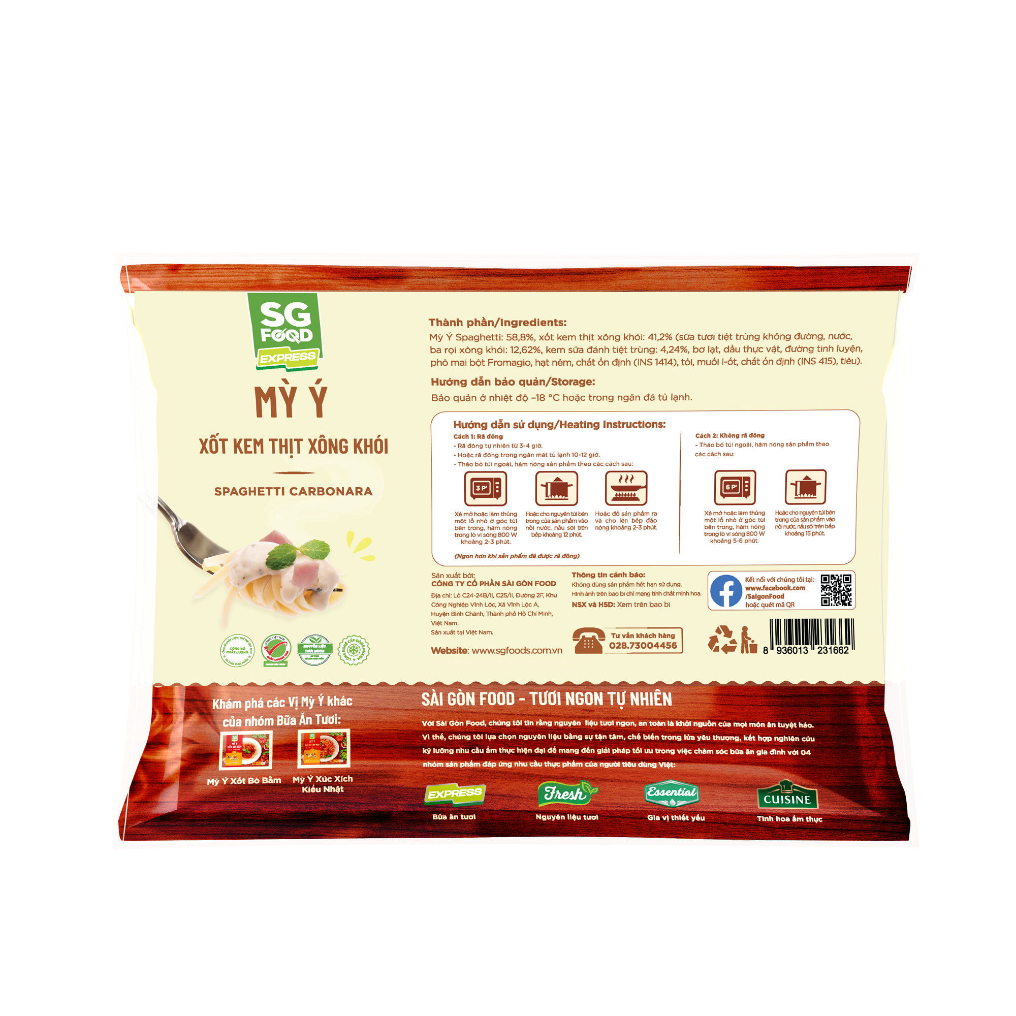 Mỳ Ý Spaghetti:58,8%, xốt kem thịt xông khói: 41,2% (sữa tươi tiệt trùng không đường, nước, ba rọi xông khói: 12,62%, kem sữa đánh tiệt trùng: 4,24%, bơ lạt, dầu thực vật, đường tinh luyện, phô mai bột Fromagio, hạt nêm, chất ổn định (INS 1414), tỏi, muối I-ốt, chất ổn định (INS 415), tiêu).