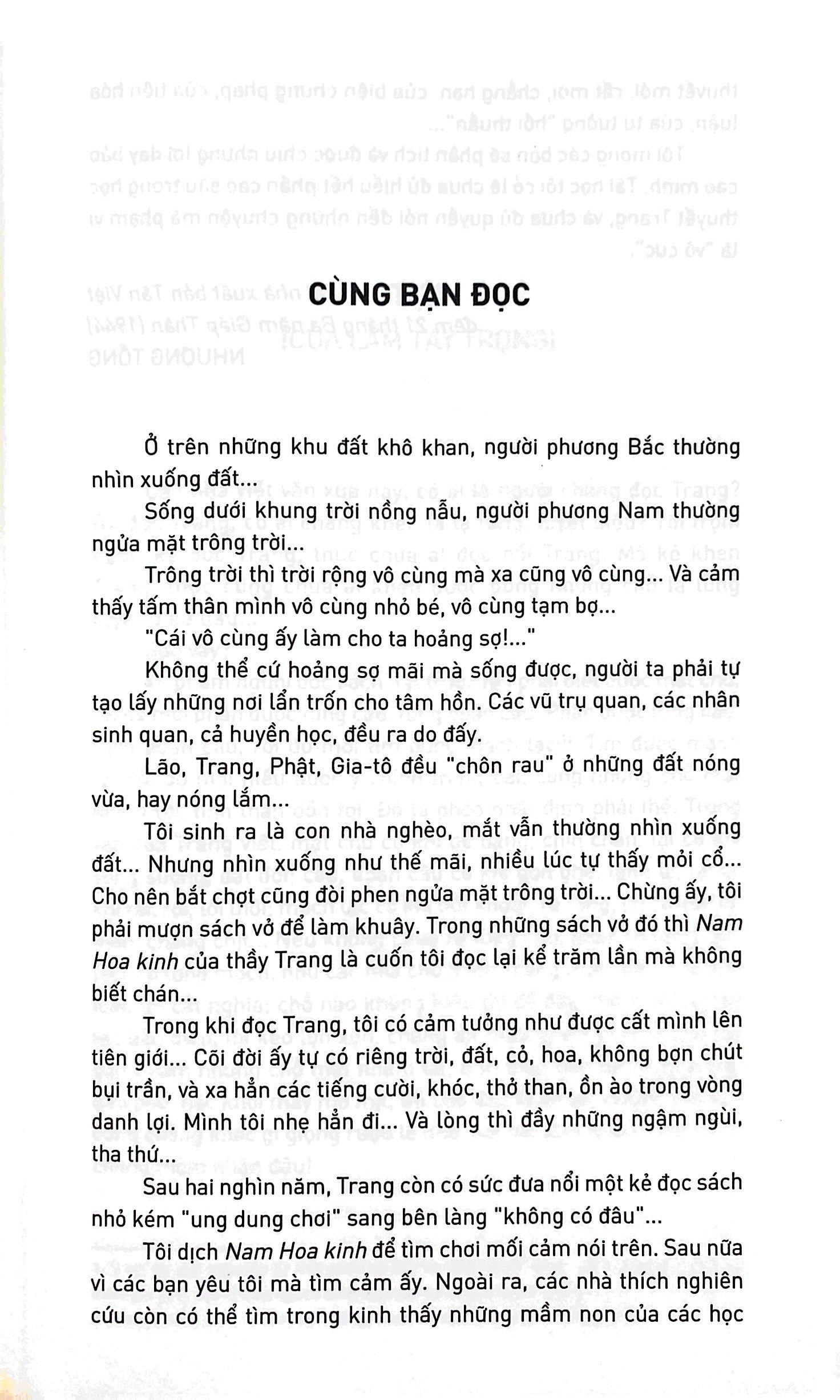 Nam Hoa kinh luôn được coi như tác phẩm sâu sắc, uyên áo bậc nhất trong số các trước tác triết học Trung Hoa. Tác phẩm bất hủ này có một ảnh hưởng lớn lao đến triết lí, văn chương, nghệ thuậ suốt trong nhiều thời đại ở cả trong lẫn ngoài Trung Hoa, và khiến tác giả của nó, Trang Tử, từ lâu đã trở thành một huyền thoại. Ở Việt Nam, Nam Hoa kinh được học giả Nhượng Tống dịch từ 1945, khá sớm so với nhiều tác phẩm kinh điển khác. Qua bản tiếng dịch tiếng Việt hàm súc, khúc chiết mà vẫn bay bổng, tài hoa của ông, Nam Hoa kinh thật sự là một trước tác luôn cần được đọc và đọc lại.