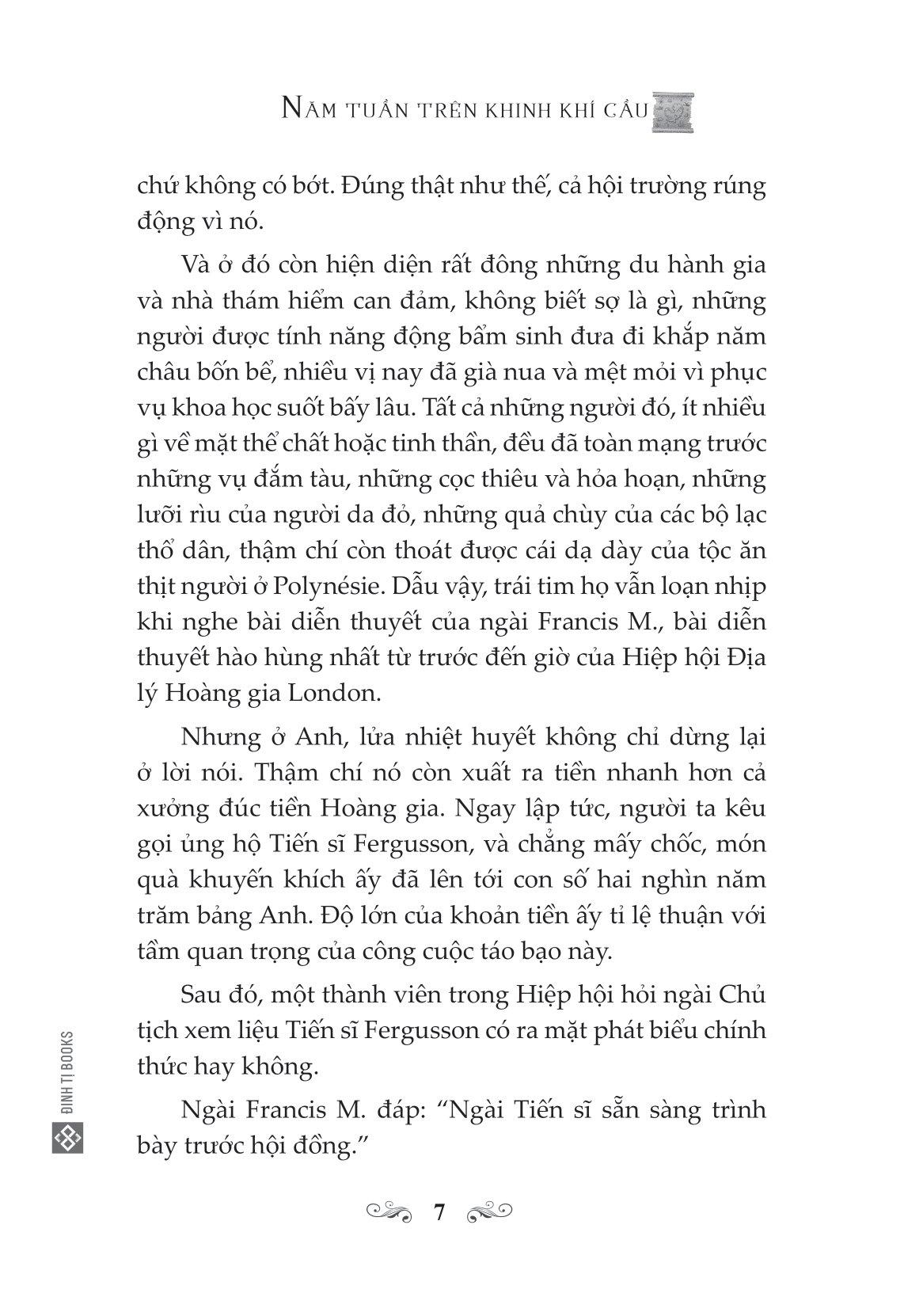 “Về chuyện trở ngại,” Fergusson nghiêm giọng nói. “Trở ngại tồn tại là để ta vượt qua. Còn rủi ro và nguy hiểm ư? Ai dám tự vỗ ngực tuyên bố ta đây chẳng bao giờ gặp nguy? Chúng ta chỉ nên thấy hiện tại qua tương lai mà thôi, vì tương lai chẳng qua chỉ là hiện tại xa hơn một chút.”