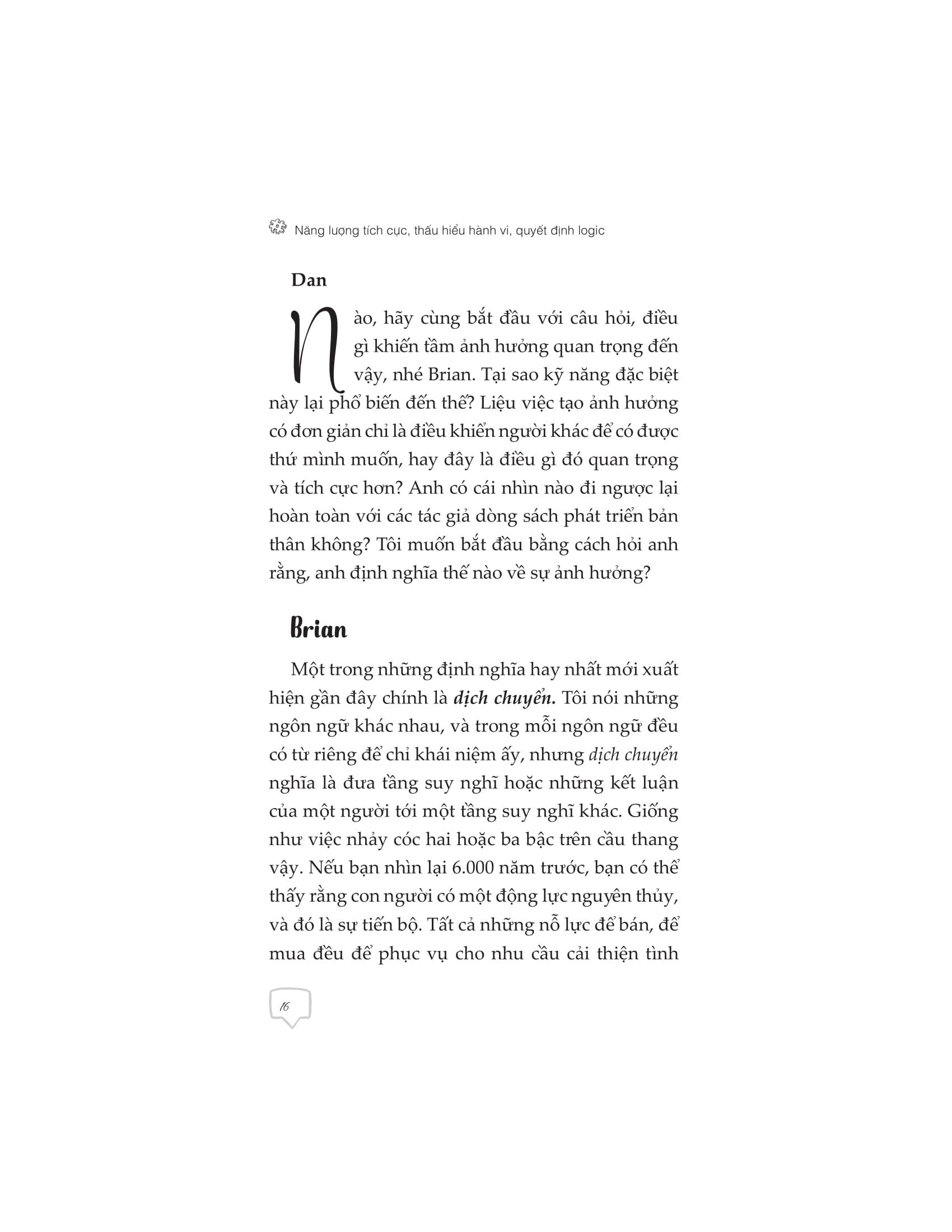 “Năng lượng tích cực, thấu hiểu hành vi, quyết định logic” sẽ giúp bạn hiểu cụ thể hơn về những quy tắc và các bước quan trọng trong việc biến kỹ năng gây ảnh hưởng trở thành thói quen trong cách suy nghĩ cũng như hành động, giúp bạn mở ra cánh cửa thành công trong sự nghiệp và cuộc sống.