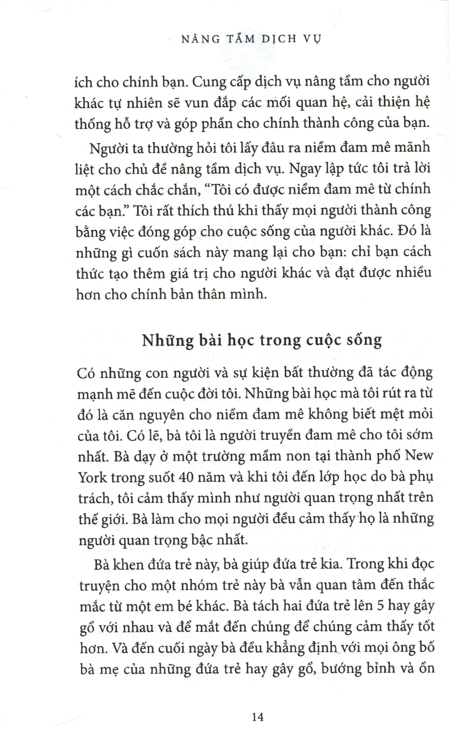 Mua tại TiktokCuốn sách tiết lộ sức mạnh của việc cung cấp dịch vụ nâng tầm và các bước đi mà người làm dịch vụ có thể áp dụng nhằm xây dựng văn hóa dịch vụ bền vững, có thể phát huy hiệu quả hàng ngày. Cuốn sách cũng trả lời rất nhiều câu hỏi về quá trình thúc đẩy dịch vụ liên tục và xóa đi những quan niệm sai lầm về dịch vụ. Cuốn sách sẽ làm nổi bật lên các công ty và những con người luôn đặt ưu tiên vào sự phục vụ, và có được những thành quả và danh tiếng tuyệt vời. Cuốn sách đưa ra những vấn đề cốt yếu cần thiết để bắt đầu thúc đẩy tổ chức kinh doanh dịch vụ – và tầm nhìn của lãnh đạo kinh doanh dịch vụ.
