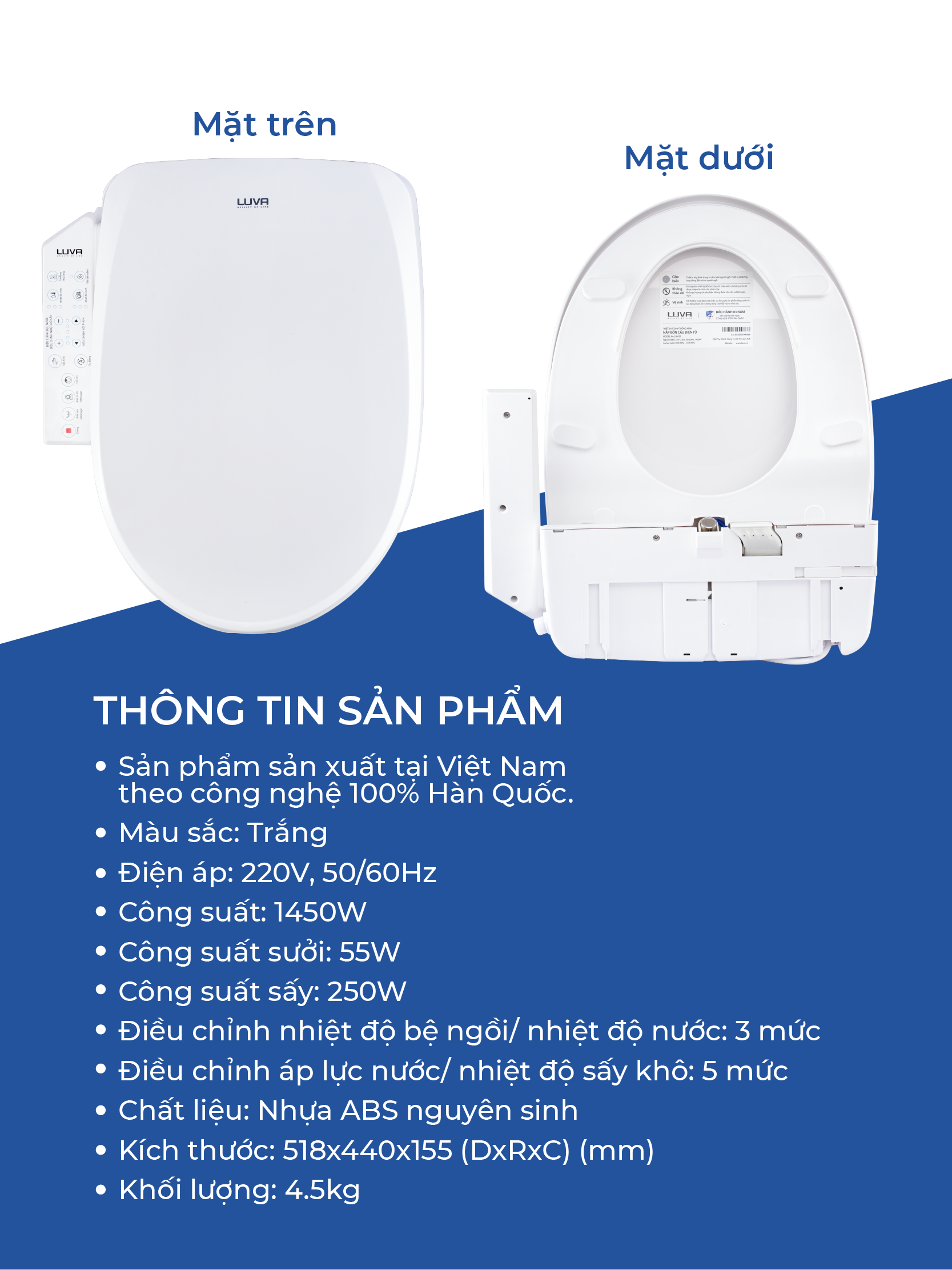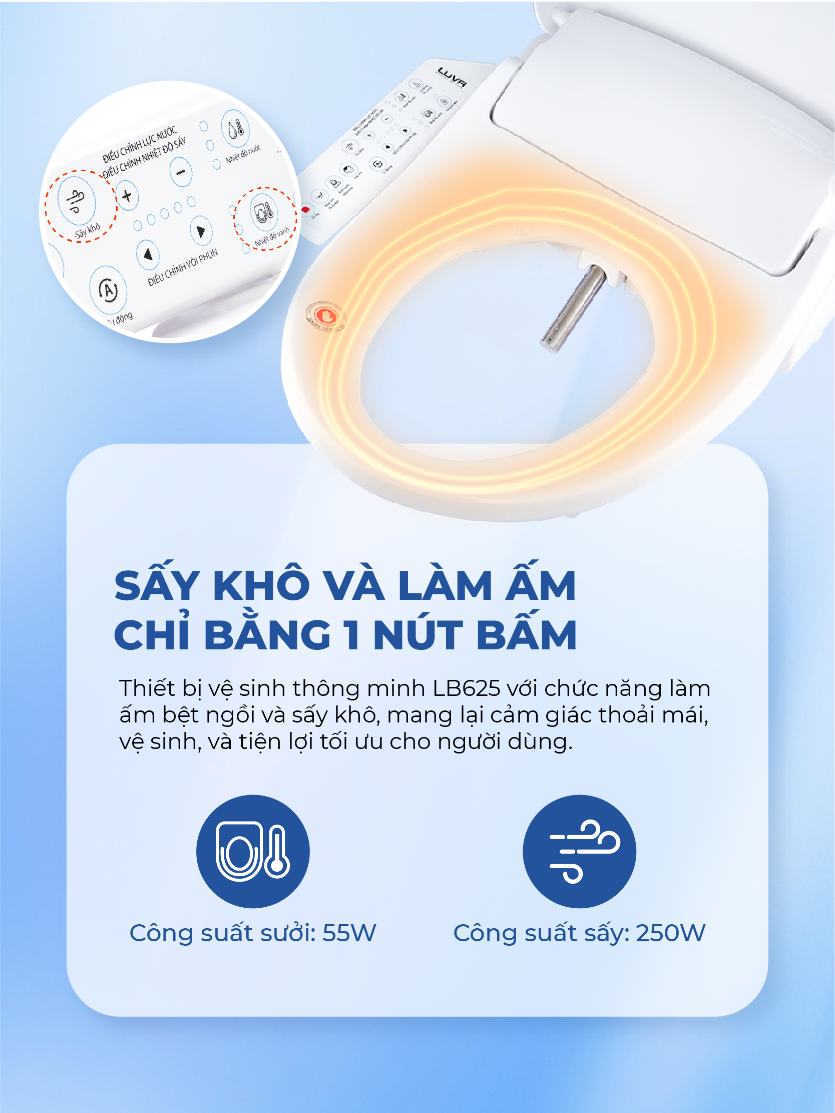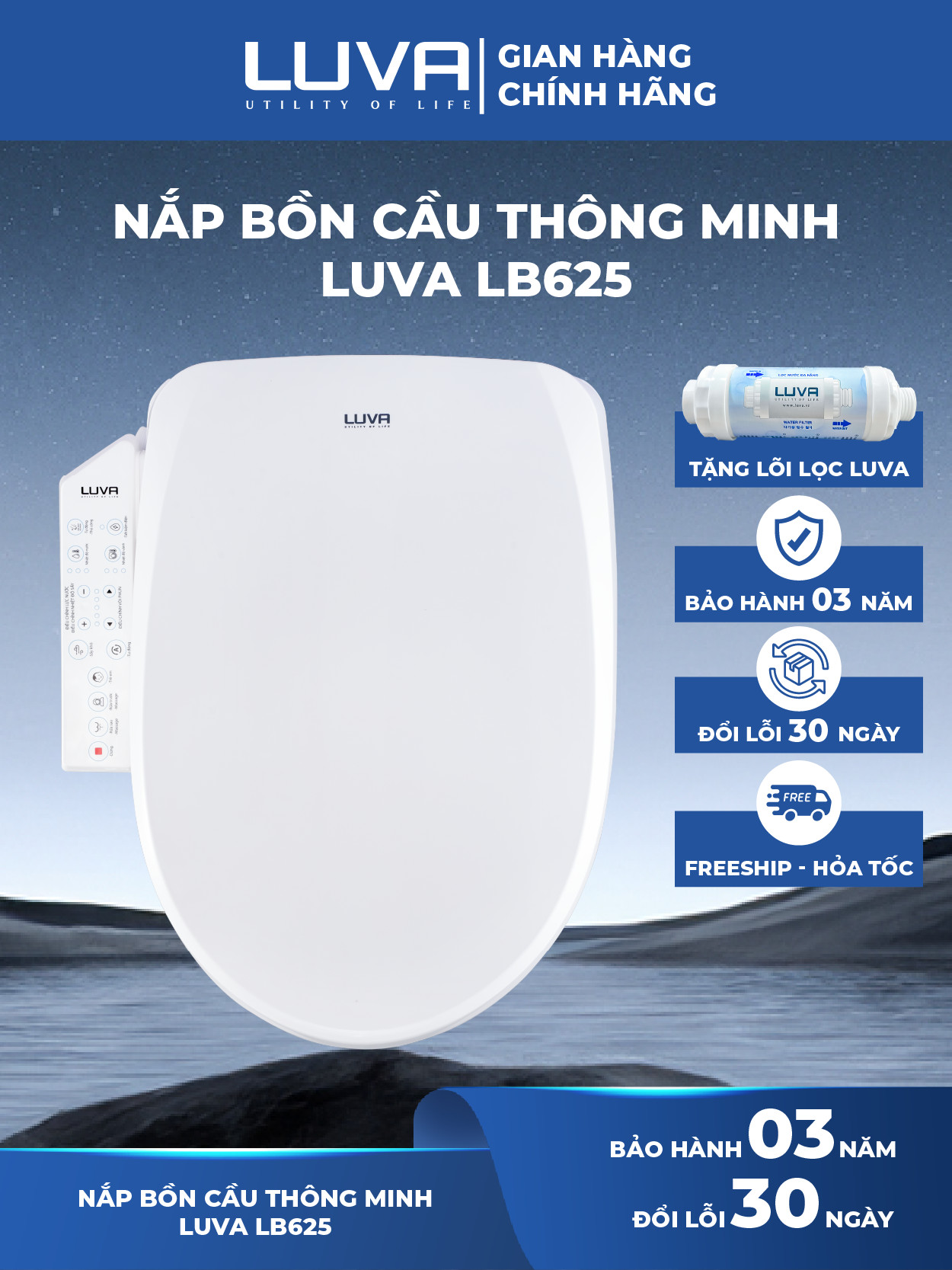 Nắp Bồn Cầu Điện Tử LUVA Bidet LB625, Bảng Điều Khiển Cảm Ứng Tiếng Việt, Bảo Hành 3 Năm, Đổi Lỗi 100 Ngày, Sấy Khô LUVA cam kết KHÔNG sử dụng bất kỳ linh