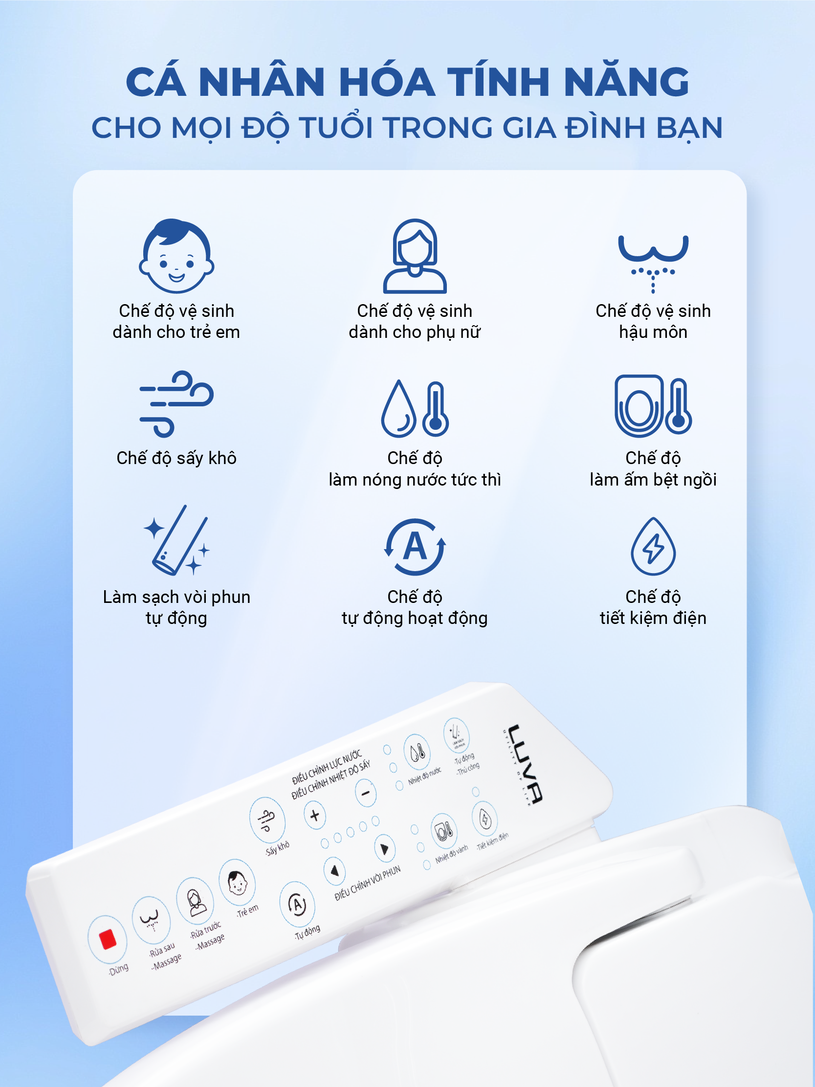 ✨Nắp Bồn Cầu Điện Tử LUVA Bidet LB625 Điều Khiển Cảm Ứng Tiếng Việt, Đổi Lỗi 100 Ngày, Sấy Khô, Chống Nước IPX5, Sấy Vành Ngồi, Chế Độ Rửa Trẻ Em
