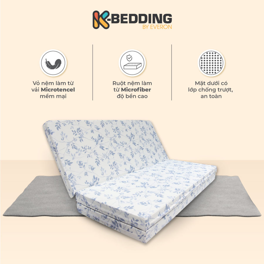 - Nệm có độ phẳng cao hợp lý nên rất tốt cho hệ tuần hoàn máu và không gây đau lưng, tạo tư thế cân bằng trong khi ngủ, mang lại sự thoải mái cho người sử dụng. Với cấu tạo 3 tấm, trọng lượng nhẹ, dễ dàng gấp gọn để sử dụng như sofa và rất thuận tiện cho việc di chuyển và cất giữ. Sản phẩm giúp bạn có thể ngủ thoái mái không chỉ trong mùa đông mà còn cả mùa hè. 2/ Ưu điểm của Nệm bông ép K-Bedding: – Nệm có lớp vỏ bọc chất liệu MicroTencel cao cấp, bền bỉ và mềm mại như lụa – Phần ruột nệm đươc sản xuất từ bông cao cấp nhập khẩu từ Hàn Quốc. – Mặt dưới được tích hợp miếng chống trượt, giữ an toàn và tăng tính tiện nghi cho người dùng – Nệm có khả năng thông khí tốt, thoát ẩm nhanh. – Có khả năng thấm hút, thông thoáng cao. – Sản phẩm không gây kích ứng da khi tiếp xúc, đảm bảo an toàn cho sức khỏe. – Độ dày nệm: 9cm.