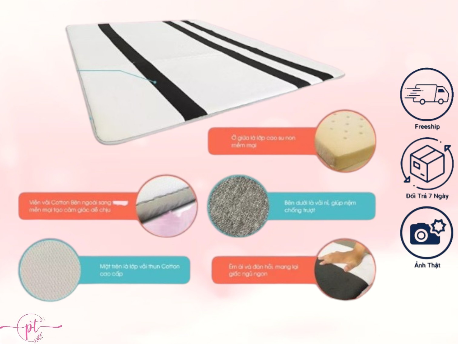 - Nệm Pe Hàn Quốc là sản phẩm ổn định về chất lượng, bề mặt nệm chắc chắn, không bị xẹp lún theo thời gian. Nệm có độ phẳng cao, nâng đỡ cơ thể, giúp sự