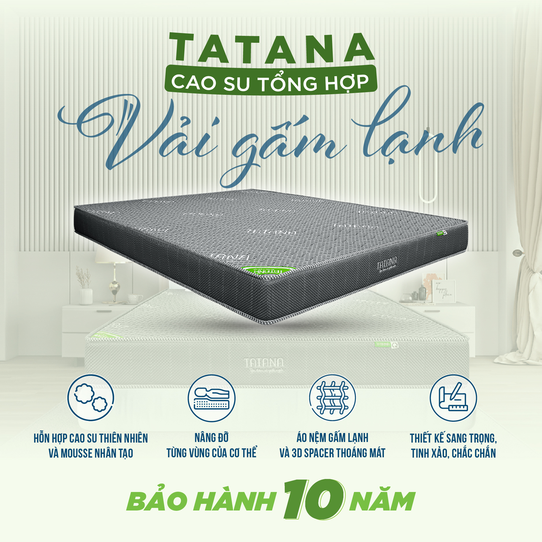 ✨Nệm Cao Su Tổng Hợp Vải Gấm Lạnh Tatana Dạng Thẳng, Nâng Đỡ Cơ Thể, Êm Ái , Bảo Hành 10 Năm