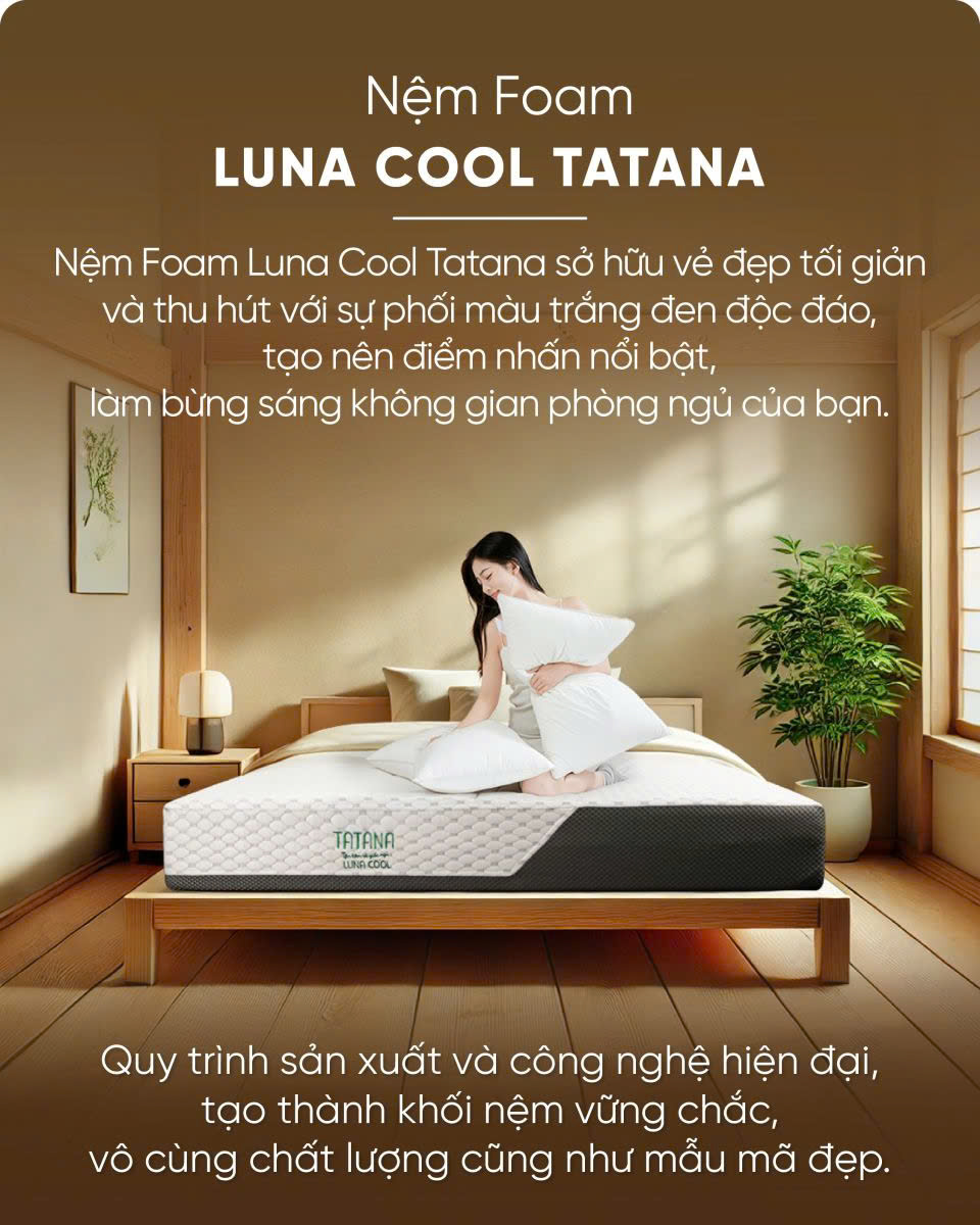 • Lớp nệm Gel Memory Foam xanh: Đây là một vật liệu mềm và êm nhẹ. Chất liệu còn có khả năng lưu thông không khí và chống cháy tốt. Thiết kế với độ dày 5cm bên trên ôm sát cơ thể, tạo độ êm ái mát lạnh cho cơ thể khi tiếp xúc. Ngoài ra, Gel Memory foam còn có khả năng thấm hút và cách điện tối ưu. Bên trên bao phủ bởi lớp áo nệm sợi Cool lạnh kết hợp cùng vải 4D Spacer tăng tính thẩm mỹ cho sản phẩm Áo nệm: Nệm Foam Luna Cool được bao phủ bởi lớp áo nệm Cooling có các sợi Cool lạnh giúp tăng hiệu quả làm mát, êm ái và mềm mại cho nệm. Ngoài ra, nệm còn sử dụng vải 4D Spacer với khóa kéo chắc chắn vừa tăng tính thẩm mỹ cho sản phẩm vừa giúp người dùng dễ dàng hơn trong quá trình vệ sinh. Đặc tính vượt trội của nệm Luna Cool Tatana  Nhờ vào tính năng làm mát của lớp vải Cooling, Nệm Foam Luna Cool đem đến cho người dùng cảm giác thoải mái và dễ chịu nhất dù trong bất kỳ điều kiện thời tiết nào. Bên cạnh đó, nệm có tính năng điều hòa nhiệt độ giúp người dùng cảm thấy ấm áp vào những ngày đông se lạnh, và mát mẻ vào những ngày hè oi bức Ngoài ra, Nệm Foam Luna Cool còn sở hữu độ đàn hồi cao, giúp nâng đỡ trọn vẹn các đường cong cơ thể. Tính năng này hạn chế tình trạng nhức mỏi và đau cột sống sau những giấc ngủ dài hàng đêm.