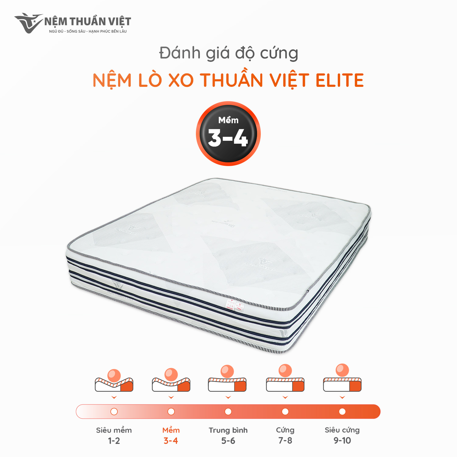 1. Công nghệ tiên phong chăm sóc giấc ngủ Nệm lò xo Thuần Việt Elite, dòng nệm lò xo thế hệ mới sử dụng công nghệ lò xo túi độc lập phân bố hợp lý nhằm tạo ra bề mặt nệm vững chắc.Từng con lò xo được sản xuất  bằng chất liệu thép chống oxy hóa, trải qua quá trình xử lý nhiệt đạt chuẩn, gia tăng độ đàn hồi và tuổi thọ nệm. 2. Đàn hồi, nâng đỡ linh hoạt theo từng chuyển động cơ thể Bên cạnh những túi lò xo vững chãi, mặt trên nệm còn kết hợp lớp foam êm ái có khả năng ghi nhớ hình dáng đường cong và ôm từng điểm tỳ. Bảo vệ các điểm tiếp xúc như hông - lưng giữ ở tư thế đúng, hỗ trợ xoay trở mình thoải mái mang trải nghiệm cân bằng tuyệt vời cho cơ thể. 3. Giảm rung động và không làm phiền người nằm cạnh Một trong những ưu điểm nổi bật của nệm lò xo túi độc lập là khả năng cách ly chuyển động cực kỳ tốt. Khi di chuyển hoặc thay đổi tư thế ngủ, lò xo sẽ hấp thụ và phân tán lực để không ảnh hưởng đến người nằm cạnh. Đảm bảo giấc ngủ sâu và không bị gián đoạn bởi tiếng ồn.  4. Thoáng khí và tản nhiệt tối đa  Việc ứng dụng công nghệ lò xo túi độc lập tiên tiến giúp kích hoạt lưu thông không khí bên trong nệm, đẩy khí nóng lên bề mặt thông qua lớp áo nệm đặc biệt. Áo nệm được may từ vải dệt kim cao cấp, cho khả năng chịu nhiệt và gia tăng thông khí tạo môi trường ngủ mát mẻ trong mọi thời tiết.  5. Kháng khuẩn nấm mốc, an toàn cho sức khoẻ Cuối cùng nhờ vào sự cách ly độc lập giữa các túi lò xo, sẽ giúp ngăn ngừa sự tích tụ của nấm mốc và vi khuẩn bên trong nệm. Đặc biệt, áo nệm được làm từ vải gấm cao cấp, không chỉ tăng cường sự êm ái mà còn có khả năng thấm hút tốt, chống nấm mốc và kháng khuẩn vượt trội.