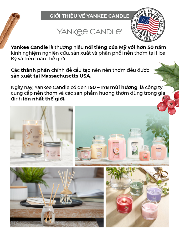 THÔNG TIN MÙI HƯƠNG: Các tầng hương: - Tầng hương đầu: Chanh, Cam, Nước - Tầng hương giữa: hoa Hồng,Linh Lan, Huệ Xanh - Tầng hương cuối: Gỗ, Xạ hương GIỚI THIỆU THƯƠNG HIỆU: Yankee