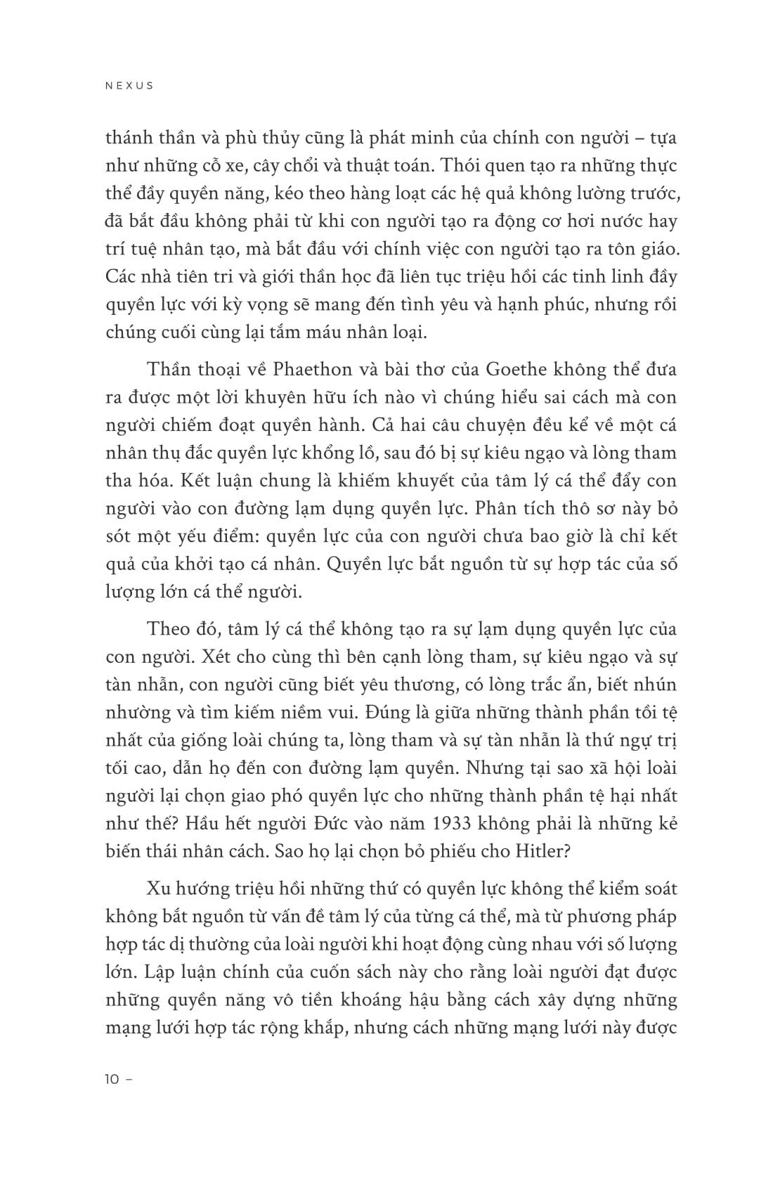 “Tầm quan trọng của những câu chuyện tiết lộ điều cơ bản về sức mạnh của loài người chúng ta, và nó cũng lý giải vì sao sức mạnh không phải lúc nào cũng đi đôi với sự khôn ngoan. Góc nhìn ngây ngô về thông tin nói rằng thông tin dẫn đến sự thật, và biết sự thật giúp mọi người đạt được cả quyền năng lẫn sự thông tuệ. Nghe có vẻ thật vững vàng. Nó ngụ ý rằng những kẻ phớt lờ sự thật sẽ khó mà đạt uy quyền, trong khi những người tôn trọng sự thật luôn có thể, và uy quyền của những người tôn trọng sự thật thì lại đã được trui rèn nhờ sự thông tuệ. Niềm tin này giả dụ rằng những kẻ khinh thị sự thật về sinh học của con người có thể là những kẻ phân biệt c.hủng tộc nhưng lại không đủ khả năng sản xuất các loại thuốc có tầm ảnh hưởng hay chế tạo các loại v.ũ khí sinh học tàn ác, trong khi những người hiểu biết về sinh học sẽ có năng lực sản xuất các sản phẩm nói trên nhưng họ lại không sử dụng chúng để phục vụ các hệ tư tưởng phân biệt c.hủng tộc. Nếu đó là sự thật, chúng ta có thể ngủ một giấc thật sâu, tin rằng các vị tổng thống, giáo chủ, và CEO sẽ luôn minh triết, chân thành. Một chính trị gia, một phong trào, hoặc một đất nước có thể vượt trội ở đâu đó với sự giúp đỡ của những lời nói dối và sự lọc lừa, nhưng về lâu dài nó cũng chỉ là một chiến lược khéo quá hóa vụng mà thôi.”