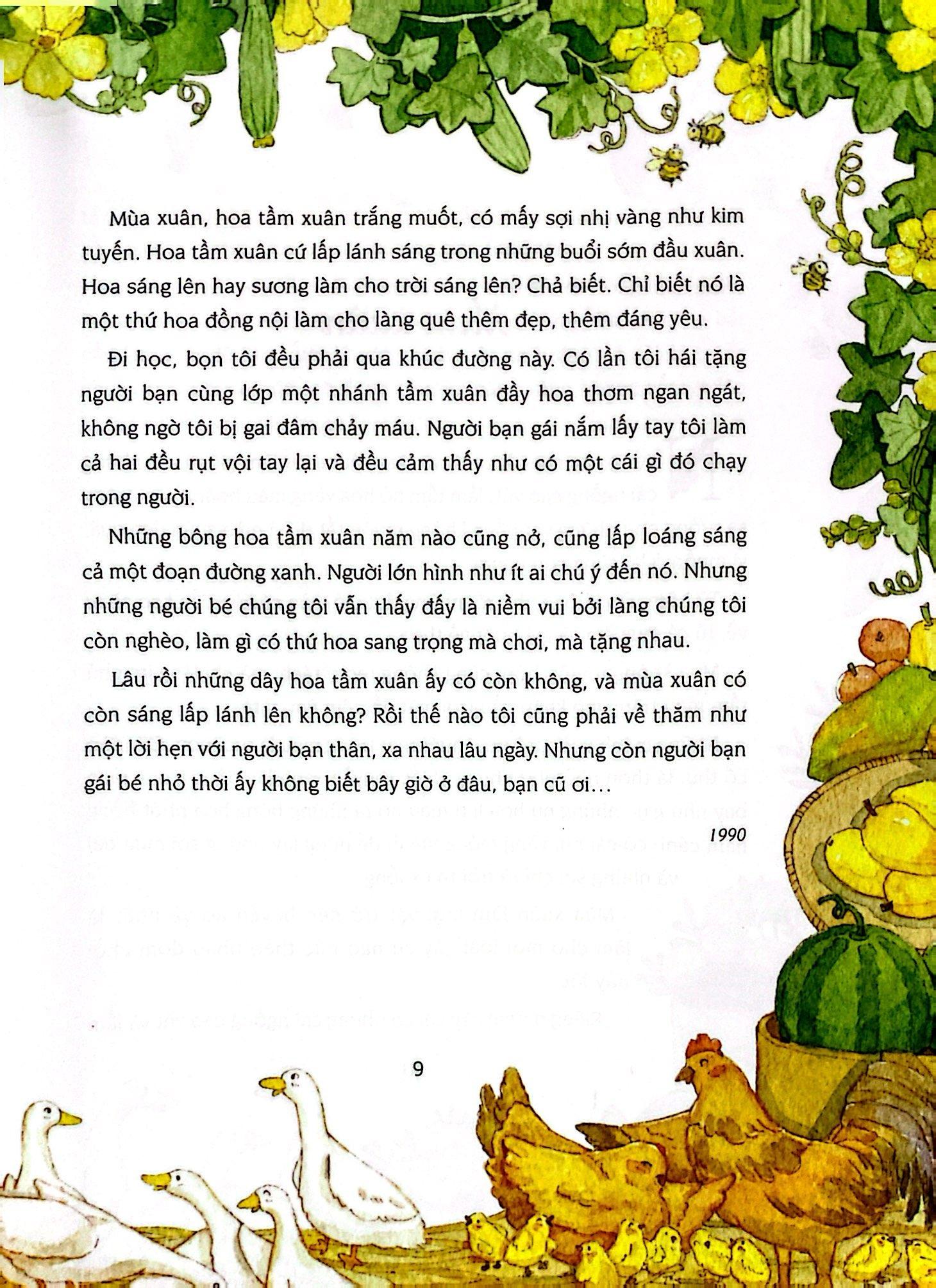 Dường như mọi vật qua góc nhìn của ông dẫu rất bình thường, đôi khi tưởng tầm thường, như cây rau sam, rau tập tàng nằm rạp m.ình trên đất, hay đơn giản là những giọt gianh “trông trong vắt” tí tách từ mái nhà tranh làm chỗ nước rơi “lõm sâu xuống, trơ ra vài miếng gạch hồng hồng, vài viên sỏi”, mái gianh “lơ xơ lác xác như một mái đầu lười cắt tóc” (Giọt gianh) cũng trở thành nỗi nhớ, niềm thương của người bé khi trở thành người lớn. Cái thuở bé bỏng mỗi buổi mẹ đi chợ về ngồi ngóng “cái dáng đi tất tưởi” của mẹ, ngóng cả món quà chợ mẹ cho khi thì cái bánh đa khoai, lúc là cái bánh chưng gù, một xâu hạt mít... Những món quà tuổi thơ giờ nghĩ lại đó còn là “tình thương yêu vô bờ bến của mẹ dành cho tôi” (Quà chợ). Có lẽ, nhà văn dùng ngôn từ vẽ lên từng cái lá, bông hoa, từng góc vườn, ruộng lúa không chỉ đơn giản muốn lột tả cái đẹp của quê hương, hơn hết ông muốn gửi gắm cả nỗi nhớ niềm thương về một nơi ông đã sinh ra và lớn lên, nơi có những kỉ niệm bên gia đình.