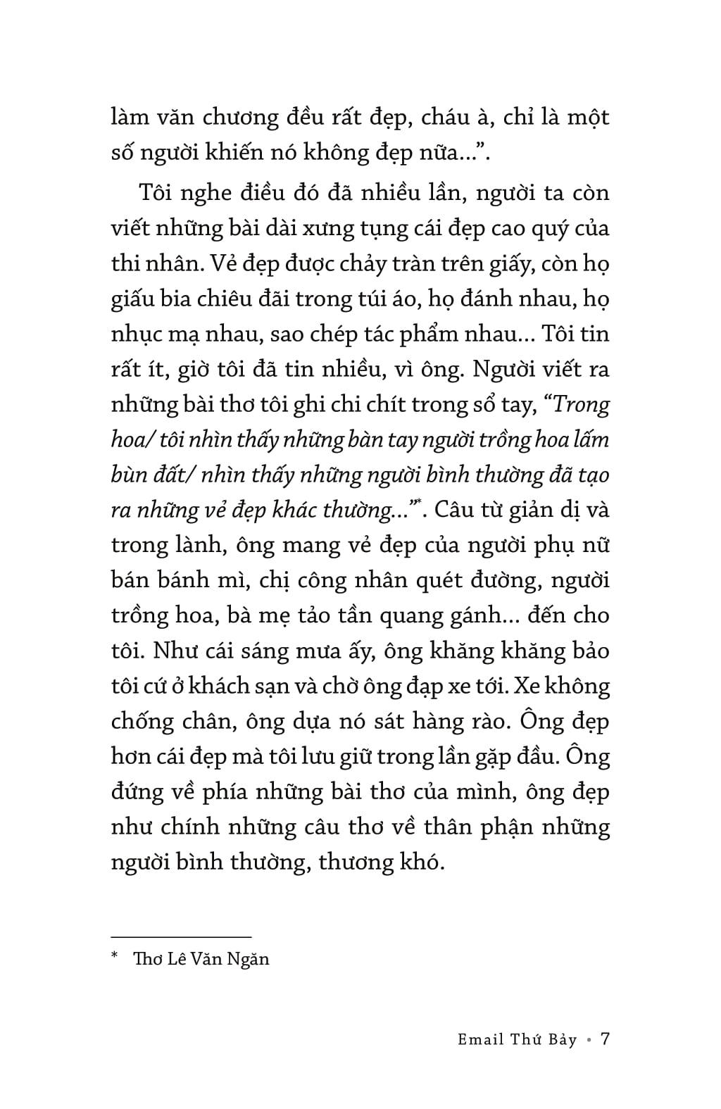 Với “Ngày mai của những ngày mai”, gọi là tản văn cũng được, truyện cũng được, gọi ghi chép của nhà văn Nguyễn Ngọc Tư trên con đường tìm kiếm những vẻ đẹp lấp lánh giữa bao khắc nghiệt của đời sống, cũng không sai chút nào. Đó là những con người mong muốn “đối diện cuộc đời, để chiến đấu bảo vệ cái đẹp” (“Giá của một gương mặt”), là người mẹ ngẫm nghĩ về những “câu trả lời bao dung nhất, ít đau đớn nhất” cho cậu con trai đang ở độ tuổi thắc mắc đủ thứ chuyện trên đời (“Món nợ không thể đòi”), là ông già cố “giữ một nếp nhà, giữ phong tục cũ; giữ cho cái sân bông rực rỡ, lung linh trong ký ức của những đứa trẻ xa nhà” (“Hạt gửi mùa sau”), hoặc có khi chỉ là biểu tượng “cái giỏ đồ ít ỏi [nhưng] oằn trĩu niềm lo nghĩ, nỗi thương yêu” (“Tần ngần giữa chợ”).