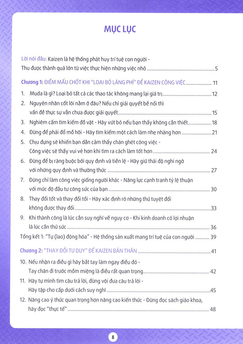 Kaizen của Toyota vốn là hệ thống được sinh ra tại nơi sản xuất nhưng đồng thời Kaizen cũng được xem là hệ thống đào tạo những con người biết suy nghĩ thông qua tạo ra những cơ hội để họ đưa ra trí tuệ. Cuốn sách này sử dụng nhiều ví dụ trong công xưởng sản xuất Toyota, nhưng nếu suy nghĩ ở khía cạnh “phương pháp tư duy” thì cuốn sách này có nhiều kinh nghiệm mà bất kỳ ai, bất kể lĩnh vực nào, thậm chí học sinh tiểu học cũng có thể áp dụng để tạo ra thành quả.