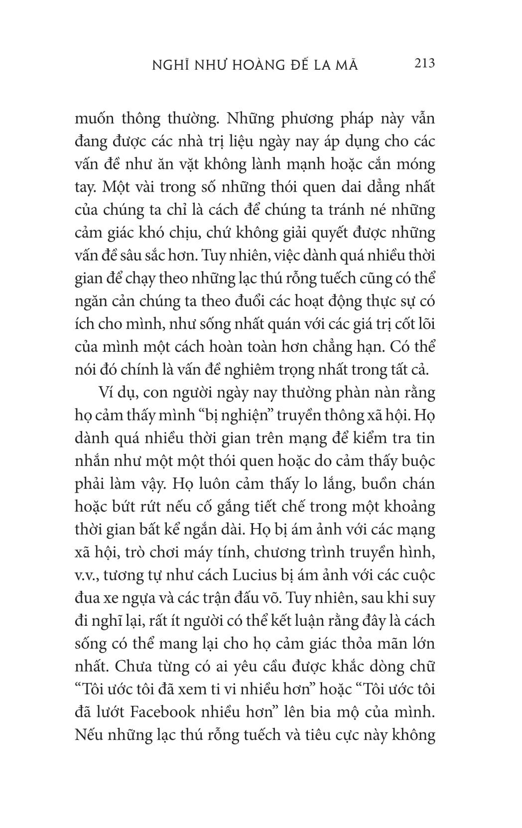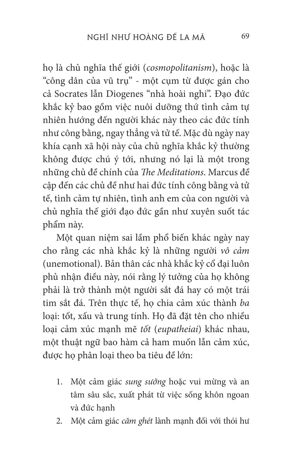 Các nhà khắc kỷ có thể dạy cho bạn cách tìm ra chí hướng trong cuộc sống, cách đối mặt với nghịch cảnh, cách chế ngự cơn giận dữ nội tại, tiết chế ham muốn, trải nghiệm những nguồn vui lành mạnh, kiên nhẫn chịu đựng nỗi đau và bệnh tật một cách đầy tự tôn, tỏ ra can đảm khi đối mặt với lo lắng, đối phó với sự mất mát, và thậm chí có thể đối mặt với sự sống hữu hạn của con người trong khi vẫn bình thản, như Socrates. Marcus Aurelius phải đối mặt với những thách thức khổng lồ trong thời gian trị vì đế chế La Mã. Tôi muốn mời bạn, với tư cách là một độc giả, cố gắng đọc cuốn sách này theo một cách đặc biệt, thử đặt mình vào vị trí của Marcus và nhìn cuộc sống qua đôi mắt ông, qua lăng kính triết lý của ông. Hãy cùng xem chúng ta có thể đồng hành cùng ông trong chuyến hành trình của ông để qua từng ngày tự biến mình thành một nhà khắc kỷ đầy bản lĩnh hay không. Nếu Số phận cho phép, có lẽ sẽ có nhiều người hơn có thể áp dụng sự khôn ngoan của chủ nghĩa khắc kỷ vào những thách thức thực sự và những vấn đề hằng ngày của cuộc sống hiện đại. Tuy nhiên, sự thay đổi đó sẽ không dễ xảy ra. Nó chỉ xảy ra khi chúng ta đưa ra một quyết định chắc chắn rằng, ở đây và ngay bây giờ, chúng ta sẽ bắt đầu áp dụng những ý tưởng như thế vào thực tế. Như Marcus đã viết cho chính mình: Đừng lãng phí thời gian tranh luận về việc một người tốt nên như thế nào; hãy là một người tốt.