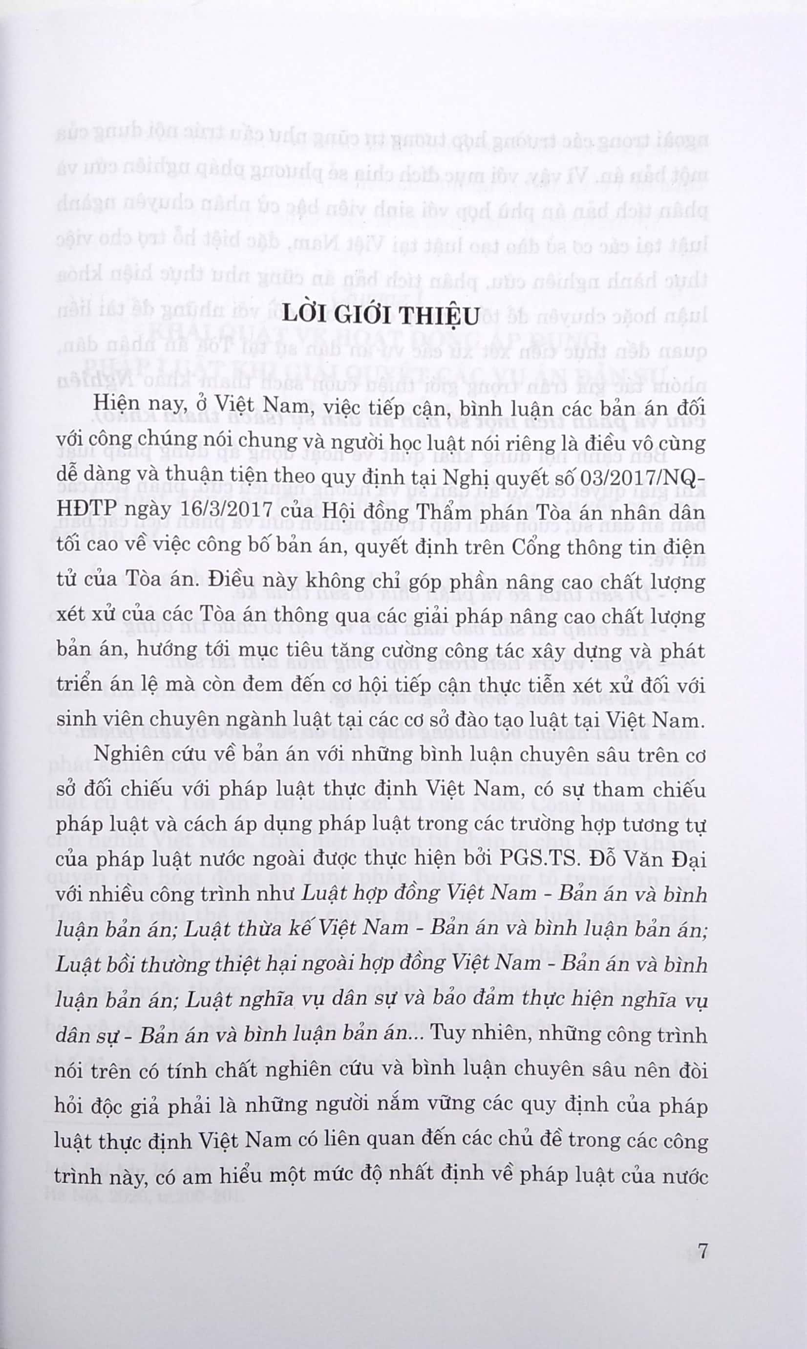 Nội dung cuốn sách đề cập các bản án dân sự về nhiều lĩnh vực khác nhau như thừa kế, thế chấp, trách nhiệm bồi thường thiệt hại do sức khỏe bị xâm phạm,… và đưa ra những phân tích, đánh giá nội dung các bản án. Đây là tài liệu hữu ích đối với giảng viên, sinh viên ngành Luật trong hoạt động nghiên cứu khoa học, giảng dạy, học tập, thực hành phân tích các tình huống cụ thể trong thực tiễn thi hành pháp luật dân sự ở nước ta hiện nay.