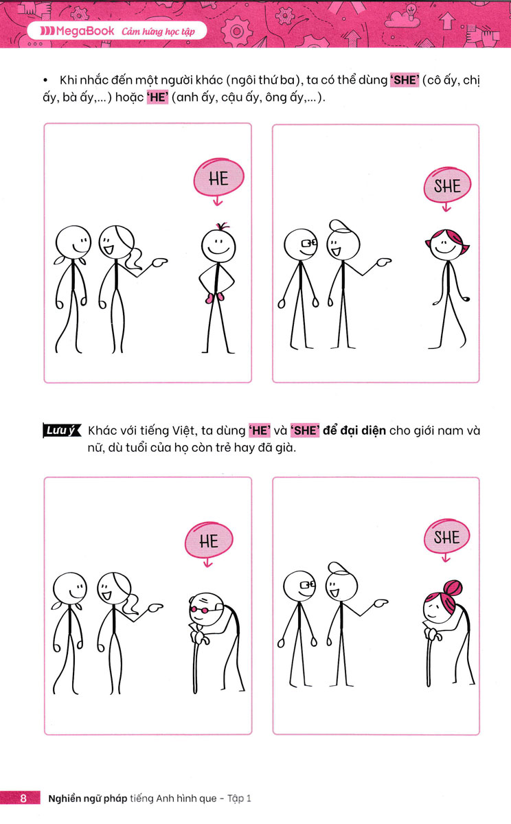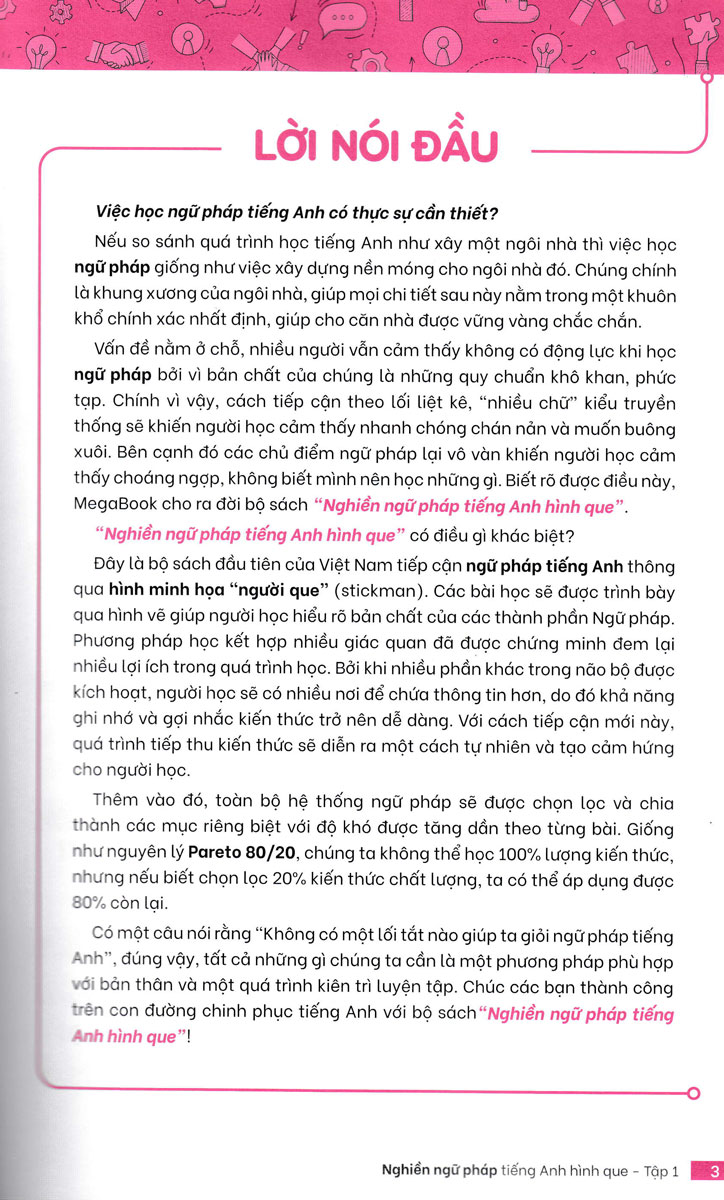 Nghiền Ngữ Pháp Tiếng Anh Hình Que là bộ sách đầu tiên của Việt Nam tiếp cận ngữ pháp tiếng Anh thông qua hình minh họa “người que” (stickman). Các bài học sẽ được trình bày qua hình vẽ giúp người học hiểu rõ bản chất của các thành phần Ngữ pháp. Phương pháp học kết hợp nhiều giác quan đã được chứng minh đem lại nhiều lợi ích trong quá trình học. Bởi khi nhiều phần khác trong não bộ được kích hoạt, người học sẽ có nhiều nơi để chứa thông tin hơn, do đó khả năng ghi nhớ và gợi nhắc kiến thức trở nên dễ dàng. Với cách tiếp cận mới này, quá trình tiếp thu kiến thức sẽ diễn ra một cách tự nhiên và tạo cảm hứng cho người học.