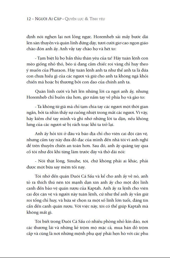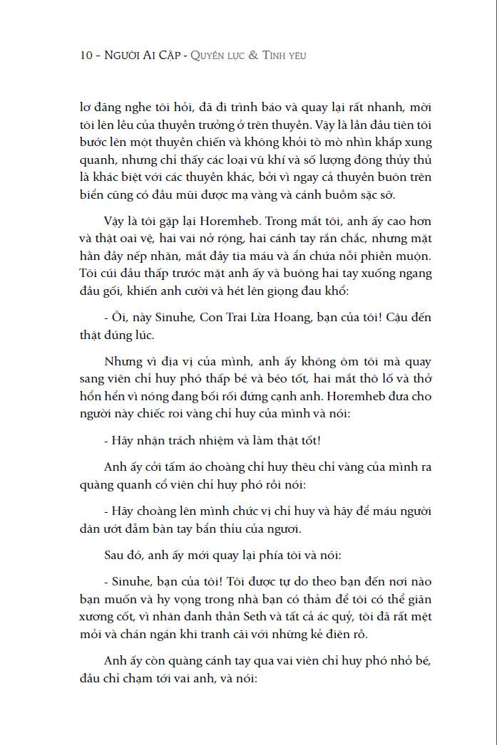 Khép lại những trang sách, bên cạnh những cảm xúc, suy tư lắng đọng về tình yêu, tình bạn, tình người, mỗi người đọc chiêm nghiệm ra những quan điểm nhân sinh cho riêng m.ình. Chúng ta cũng sẽ nhận ra rằng bản chất con người vẫn luôn không-hoàn-hảo dù ở bất kỳ thời đại nào. Là tiểu thuyết lịch sử có tính chính xác cao, “Người Ai Cập - Quyền lực và tình yêu” qua ngôn ngữ sống động của Mika Waltari giúp độc giả trải nghiệm những phong tục, tập quán, văn hóa, tín ngưỡng tôn giác, kỹ thuật y tế, chính trị và xã hội của Ai Cập cổ đại và các vùng lân cận.