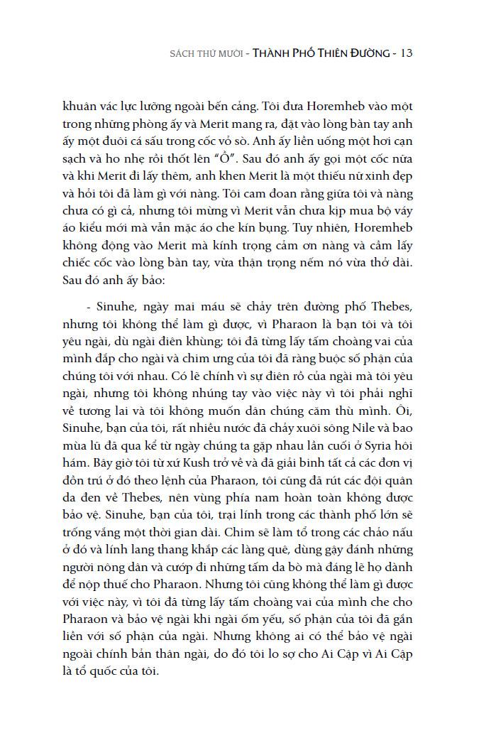 Thất vọng trước số phận, Sinuhe viết 15 chương sách kể lại những trải nghiệm và những sự kiện lịch sử mà m.ình chứng kiến, với đủ tất cả các gia vị của cuộc đời từ hạnh phúc, vinh quang đến khốn khổ, cô đơn.