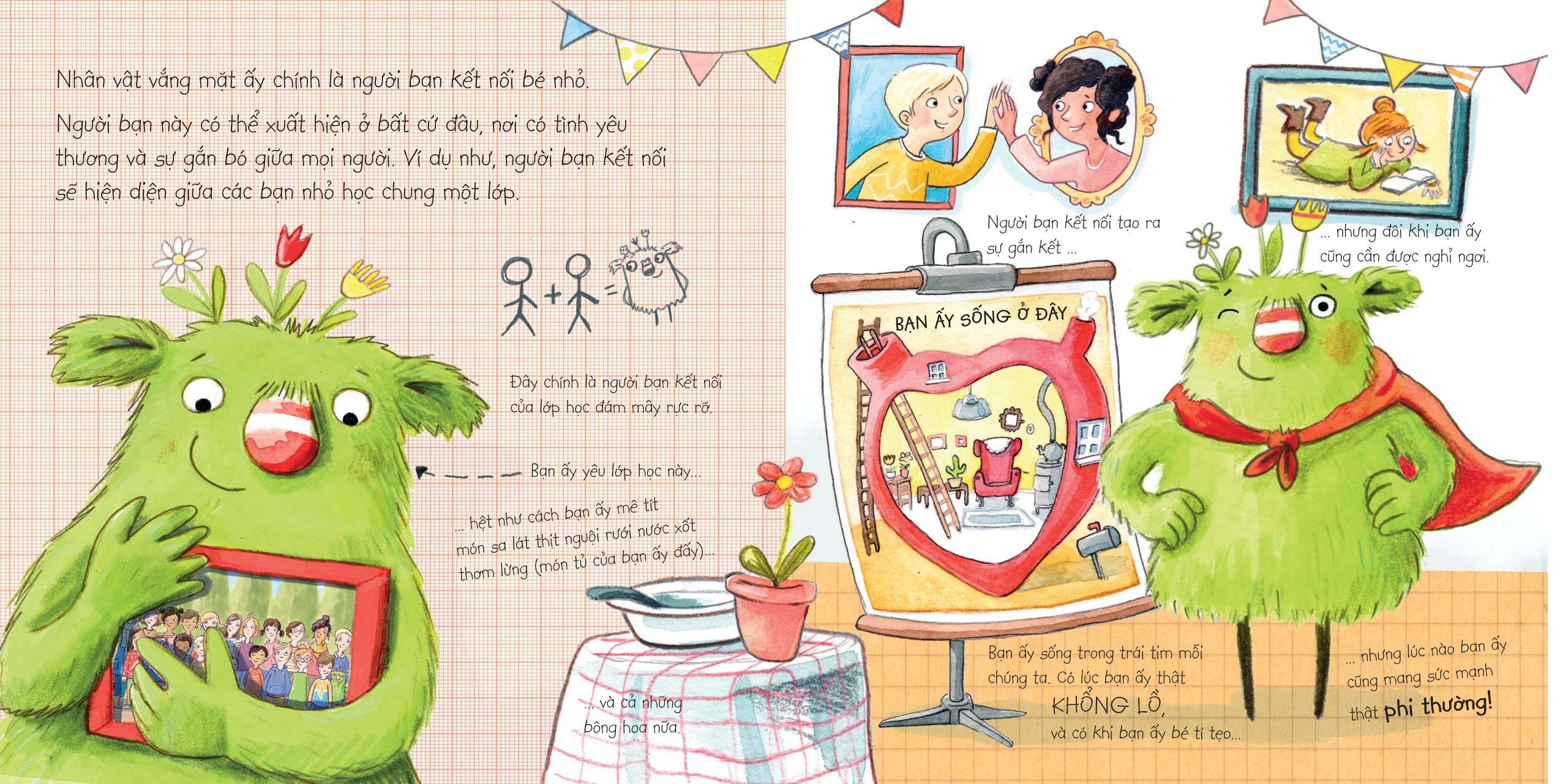 Ba cuốn sách nằm trong bộ sách “Người bạn kết nối bé nhỏ” giúp các em làm quen với một người bạn vô cùng đặc biệt: Một người bạn có bộ lông xanh lá cực kì nổi bật, lại vừa có thể thay đổi kích cỡ tuỳ theo tâm trạng của mọi người nữa! Nơi nào có tình yêu thương mà mọi người dành cho nhau, nơi đó có người bạn kết nối. Người bạn kết nối luôn hiện hữu trong trái tim chúng ta, và có thể giúp hoá giải những muộn phiền. Bạn ấy rất cần được chăm sóc bằng những lời nói và hành động chân thành, để sự gắn kết thêm bền chặt cùng năm tháng…