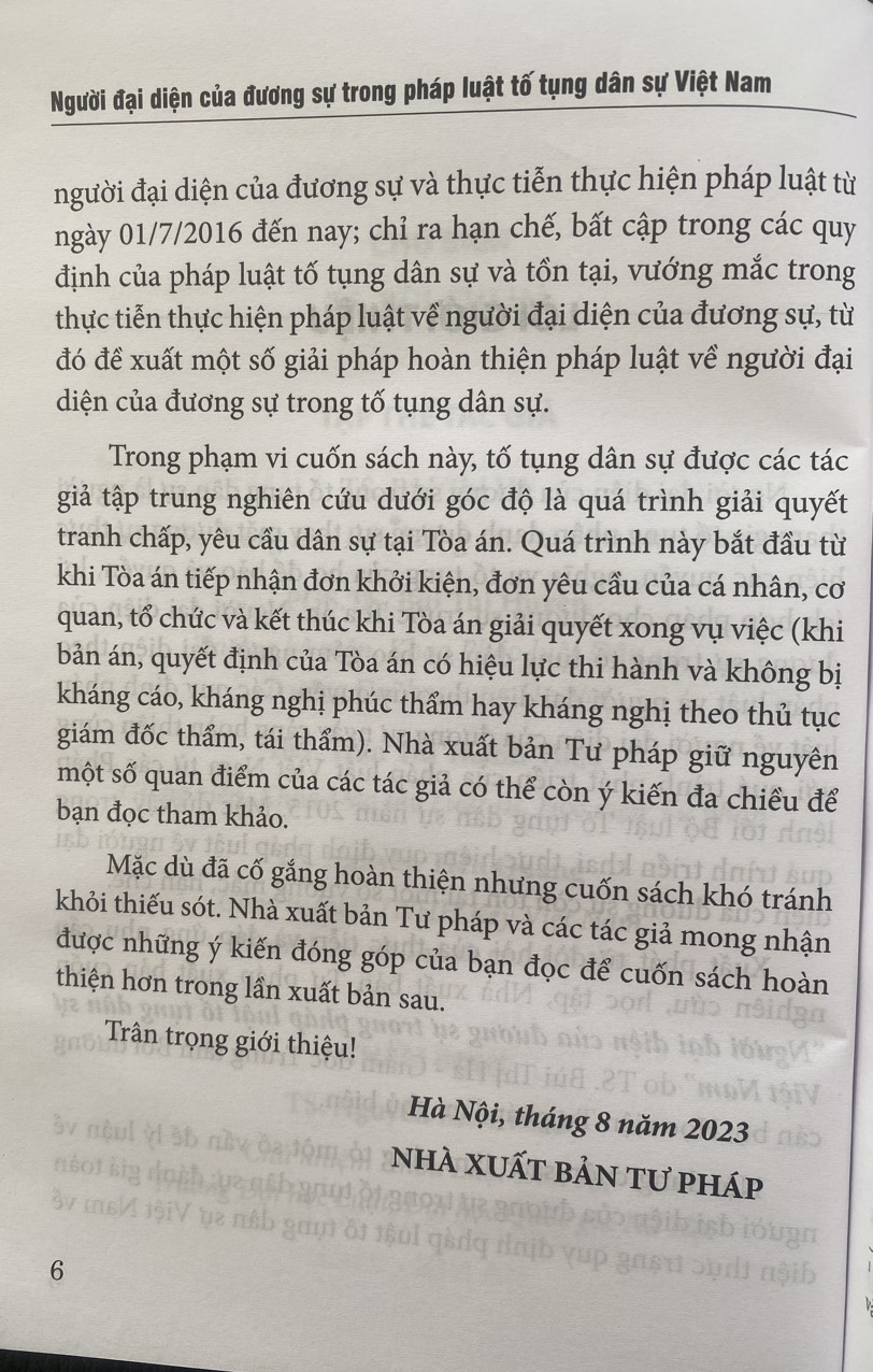 Xuất phát từ đòi hỏi của thực tiễn và đáp ứng nhu cầu nghiên cứu, học tập, Nhà xuất bản Tư pháp xuất bản cuốn "Người đại diện của đương sự trong pháp luật tố tụng dân sự Việt Nam" do TS. Bùi Thị Hà - Giám đốc Trung tâm Bồi dưỡng cán bộ, Học viện Tư pháp làm chủ biên