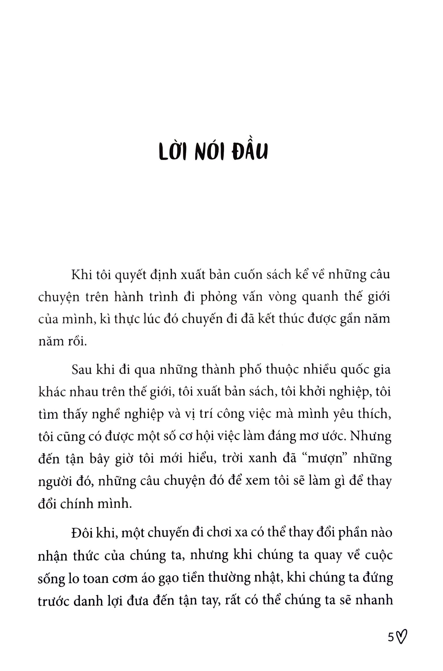 “Cuốn sách này ghi lại những hành trình mà tôi đã trải qua. Cũng giống như không ít tình tiết thường thấy trên phim ảnh, câu chuyện này mở ra từ việc theo đuổi tình yêu thất bại. Một cô gái ngoài hai mươi, trông bề ngoài ung dung tự tại nhưng nội tâm lại tràn đầy bất an và cảm giác thất bại, cô ấy đi đến từng thành phố, từng đất nước, để cùng những người khác bàn về cuộc đời và mộng tưởng, những mong mượn kinh nghiệm của người khác để vứt bỏ những lo lắng, tự ti, cảm giác bất an đang đè nặng để tìm lại niềm vui.