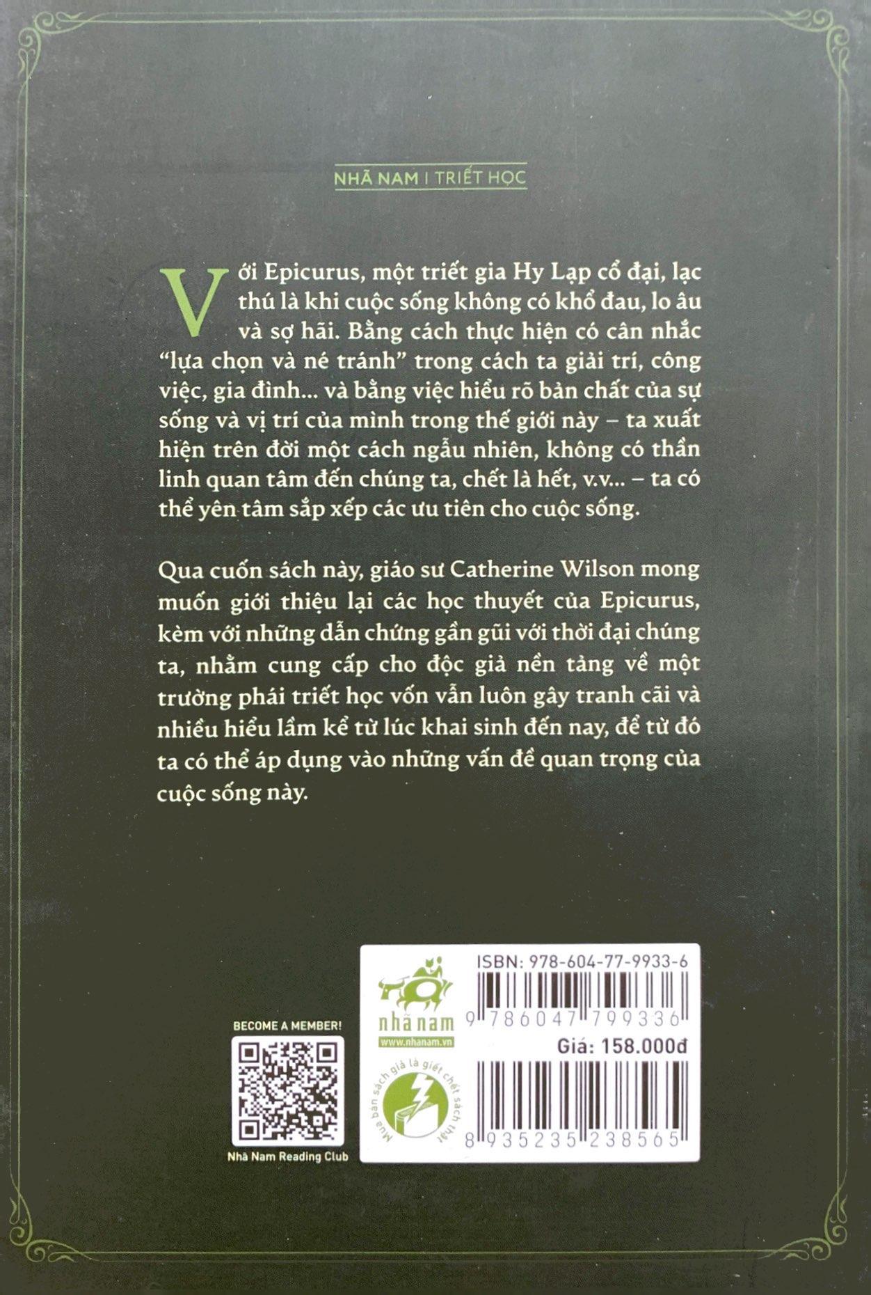 Qua cuốn sách này, giáo sư Catherine Wilson mong muốn giới thiệu lại các học thuyết của Epicurus, kèm với những dẫn chứng gần gũi với thời đại chúng ta, nhằm cung cấp cho độc giả nền tảng về một trường phái triết học vốn vẫn luôn gây tranh cãi và nhiều hiểm lầm kể từ lúc khai sinh đến nay, để từ đó ta có thể áp dụng vào những vấn đề quan trọng của cuộc sống này.