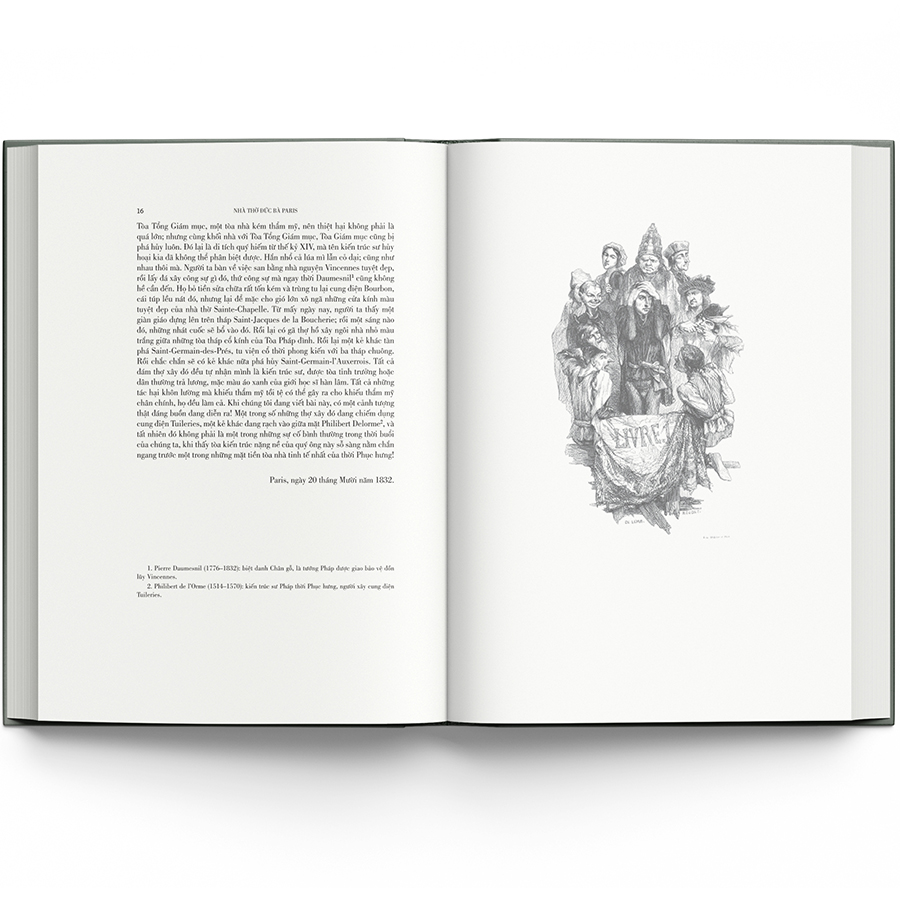 Quanh cái “nhân vật chính” là nhà thờ Đức Bà, một xã hội Paris thời Trung cổ đã được tái hiện với tất cả những gì rạng rỡ nhất và suy đồi nhất của nó, không bỏ sót tầng lớp nào từ vua chúa đến thường dân và cả những kẻ dưới đáy xã hội. Trên nền “Lễ hội của những kẻ điên”, bánh xe số phận đã xoay vần, để các cuộc gặp gỡ định mệnh xảy đến giữa cô vũ nữ Esmeralda xinh đẹp và những người ái mộ nàng. Người mãnh liệt hết mình, kẻ qua quýt vờn quanh, người sẵn sàng hy sinh, kẻ không từ thủ đoạn – họ yêu theo nhiều cách khác biệt và “đã hại lẫn nhau vì trò đùa bí ẩn của định mệnh”. Trong trò chơi đuổi bắt trớ trêu mà ai cũng mải mê chạy theo cái bóng của ái tình, từng nhân vật đã bộc lộ ra những phẩm chất giấu kín bên trong họ, với những giằng xé hết sức con người mà ta chẳng bao giờ hiểu được nếu chỉ nhìn vào bề nổi của câu chuyện mang hơi hướm “người đẹp và quái vật” này. Nhân dịp kỷ niệm 220 năm ngày sinh đại văn hào Victor Hugo, Đông A trân trọng giới thiệu ấn bản mới của Nhà thờ Đức Bà Paris. Đây là bản dịch hoàn toàn mới và đầy đủ từ nguyên tác tiếng Pháp, có thêm phần Phụ lục chứa đựng nhiều thông tin bên lề thú vị về hoàn cảnh ra đời của tác phẩm, cùng hơn 200 minh họa tuyệt đẹp từ bản in năm 1884 tại Paris.