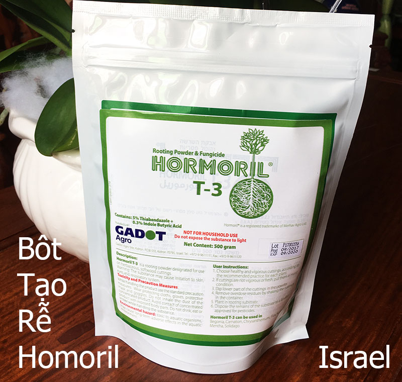 HORMORIL T-3 (bột rễ có chứa thành phần diệt nấm): T with fungicide cực kỳ quan trọng đối với một số giống cây giâm cành nhạy cảm với vi khuẩn bên ngoài. Vì vậy, tùy loại cây cần giâm cành mà nhà vườn chọn lựa Homoril 3 hay Homoril T3 phù hợp