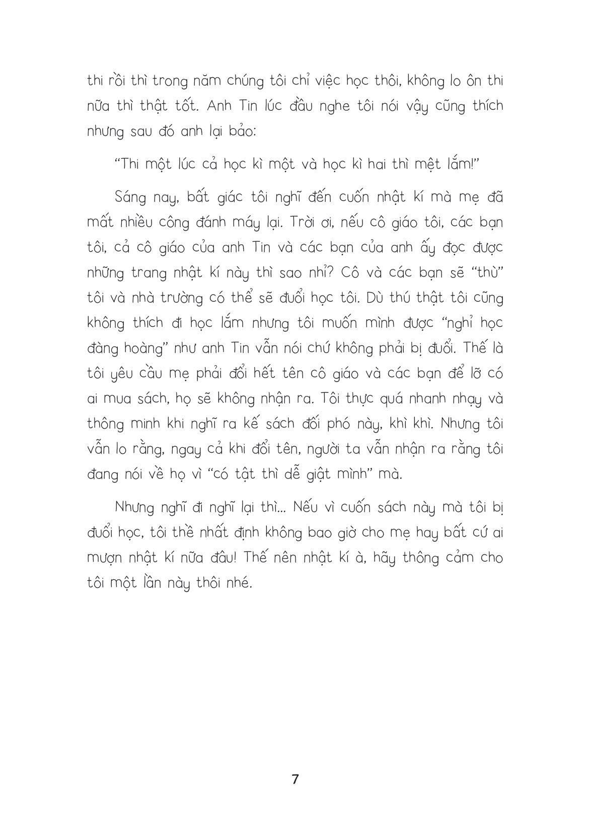 Mình là Tũn Cá, Fishy và cả Bống nữa. Bạn có thể gọi m.ình bằng tên nào cũng được, miễn là sau này, khi m.ình mở tiệm bánh, bạn mang tiền đến mua thật nhiều bánh cho m.ình là được. Năm nay m.ình bảy tuổi, học chưa giỏi và chữ viết cũng chưa đẹp. Ước mơ của m.ình là có bảy người mẹ giống hệt mẹ của m.ình bây giờ vì một mẹ thì chả bao giờ đủ cả. Lí do vì sao thì bạn hãy đọc cuốn nhật kí này là biết ngay! Khì khì!