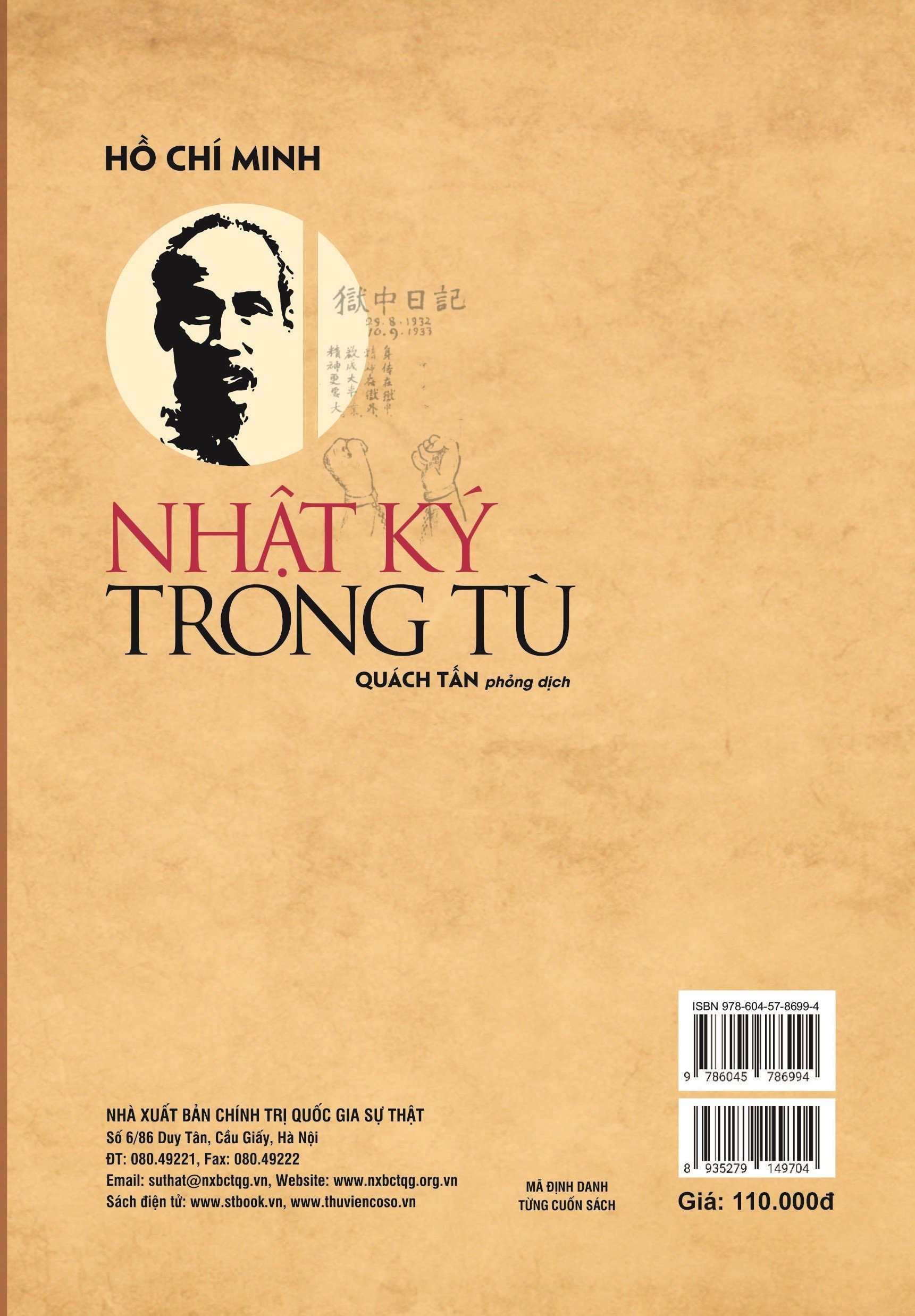 Với tấm lòng cảm phục Chủ tịch Hồ Chí Minh, nhà thơ Quách Tấn, một dịch giả thơ chữ Hán tài năng đã dành nhiều tâm huyết, công phu để dịch tập Nhật ký trong tù và nhờ một vị túc nho là nhà thư pháp Trần Thúc Lâm viết phần chữ Hán. Tập thơ được trình bày bằng lối thể hiện mới lạ, đặc biệt.