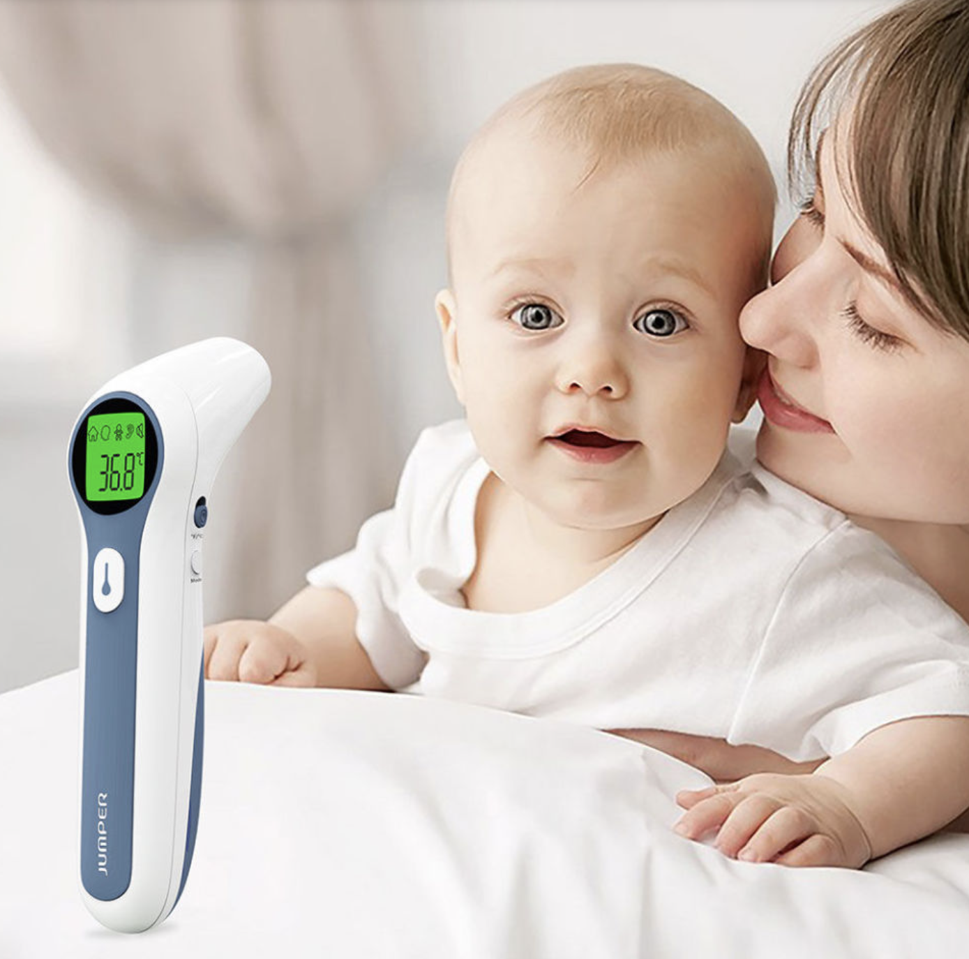 Nhiệt kế điện tử Jumper sử dụng không tiếp xúc cho cả người lớn và trẻ nhỏ. Đối với trẻ nhỏ, đầu đo từ tính không gây đau hay khó chịu. Thiết bị có thế dùng để đo tai và trán linh hoạt, khoảng cách đo dưới 5cm.