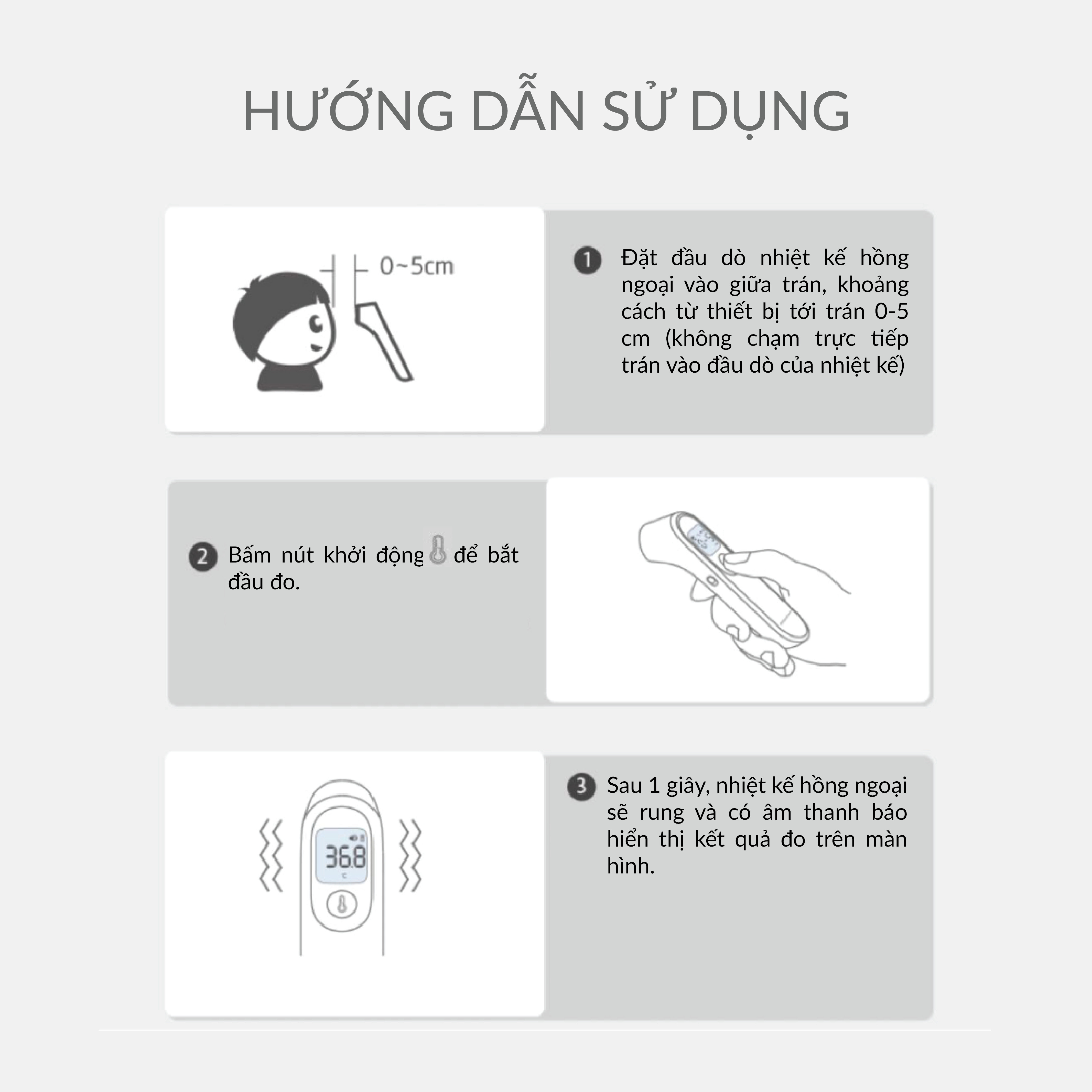 Nhiệt kế điện tử hồng ngoại không tiếp xúc *Công nghệ đo cảm biến tia hồng ngoại cho kết quả chính xác cao *Đo nhiệt độ cơ thể ở trán không tiếp xúc, trả kết