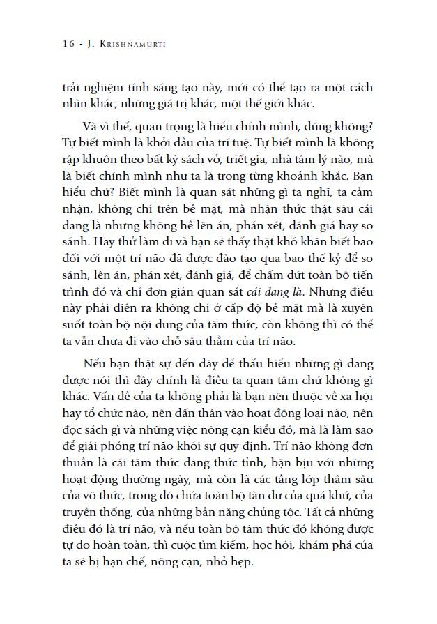 - Giải thoát tâm trí khỏi mọi sự quy định - Đã bao giờ bạn từng nghĩ, vì sao trên thế giới, có nơi chìm đắm trong nghèo khó nhưng cũng có nơi giàu có vô cùng? Vì sao những nỗ lực cải thiện bản thân, thôi thúc ta gặt hái thành công, lại đi kèm với những nỗi sợ hãi, thất bại và khổ đau? Theo triết gia Jiddu Krishnamurti, cấu trúc xã hội ngày nay được xây dựng dựa trên sự ganh tị, sự tích lũy, trong đó bao hàm sự tuân thủ, chấp nhận quyền lực, thỏa mãn tham vọng, mà về cốt lõi chính là cái “tôi”, cái bản ngã đang nỗ lực để trở thành điều gì đó. Xã hội được tạo nên từ chất liệu đó và nền văn hóa của nó – vui và khổ, đẹp và xấu, toàn bộ những nỗ lực của xã hội – quy định trí não con người. Vậy làm thế nào để tâm trí chúng ta thoát khỏi tất cả sự quy định này? Câu trả lời sẽ được tìm thấy trong quyển sách “Như ta là” (tựa gốc: “As One Is”) của Krishnamurti. Quyển sách tường thuật nội dung tám buổi nói chuyện có tính ngẫu hứng của Krishnamurti trước hàng trăm người, diễn ra dưới bóng râm của một rừng sồi nhỏ nơi thung lũng Ojai (California, Hoa Kỳ) vào mùa hè năm 1955. Tại đây, Krishnamurti đã dẫn dắt người nghe nhìn thẳng vào sự hỗn loạn, những thói quen và tư tưởng của một trí não bị ảnh hưởng bởi mọi sự quy định, đồng thời khám phá ra rằng đây là gốc rễ của mọi bạo lực cũng như khổ đau trên toàn thế giới. Xuyên suốt tác phẩm, Krishnamurti nhấn mạnh con đường duy nhất để khám phá ra sự thật cốt lõi của tất cả những điều trên, đi đến sự giải thoát, là tự biết mình; thấy chính ta như “ta là” trong thực tại, chứ không phải “ta phải là” hay “ta nên là”. Ông chỉ ra rằng bằng cách tự nhìn thấy trí não của mình đang bị chi phối ra sao bởi những uy quyền, khuôn khổ, phạm vi, truyền thống, quy định…, con người mới có thể thoát ra khỏi tất cả những điều đó. Một cách rốt ráo, Krishnamurti yêu cầu người nghe xem xét để nhận ra rằng tất cả mọi biểu hiện có vẻ tiến bộ của bản ngã không phải là sự tiến bộ dẫn đến tự do mà chỉ là guồng quay cũ của ảo tưởng; rằng sự hiểu biết trí não của chính mình, tự biết mình là con đường duy nhất dẫn đến tự do. Ông can đảm đối diện với những vấn đề thiết yếu của xã hội và dẫn dắt người nghe nhìn nhận chúng bằng minh triết để tự mình thấu hiểu, khám phá mọi sự thật bằng một tâm thức tự do hoàn toàn. Trong “Như ta là”, Krishnamurti đã lần lượt đề cập đến những vấn đề cốt lõi như: bản chất của bạo lực, vấn đề thay đổi, sự quy định của trí não, nền hòa bình thực sự, bản chất của sự sùng bái, sự tu tập tâm linh, và thế nào là thực sự lắng nghe… Ông cũng giúp cử tọa giải đáp một số thắc mắc “tại chỗ” như: dục vọng; tình trạng phạm tội ở tuổi thanh thiếu niên; bản chất của sự nhiễu loạn trong tâm trí; ý nghĩa, mục đích sống; việc nuôi dạy con cái; sự tái Với lối tiếp cận vấn đề một cách trực diện, Krishnamurti đã phơi bày tận căn nguyên gốc rễ của vấn đề, đồng thời hướng dẫn người nghe thấu hiểu cách chúng ăn sâu vào tiềm thức của chúng ta, ngăn trở ta tìm ra sự thật. Với ngôn từ giản dị, cách tiếp cận trực diện cùng những lập luận thuyết phục vốn có của Krishnamurti, “Như ta là” mang đến cho người đọc những kiến thức khai sáng đầy thông tuệ, những nhận thức mới mẻ về mặt tâm linh. Những điều suy nghiệm này tuy đã được nói ra từ hơn nửa thế kỷ trước nhưng vẫn chứa đựng những giá trị mới mẻ và thiết thực đối với thế giới cho đến ngày hôm nay. Khép lại cuốn sách, hy vọng mỗi người có thể tự tìm ra cho mình những sự thật bên trong bằng sự chú tâm trọn vẹn và quan sát chính mình từng phút giây. “Như ta là” chính là hành trang không thể thiếu cho tất cả những ai thực sự nghiêm túc trên con đường tìm kiếm hiểu biết tâm linh qua những lời dạy của Krishnamurti. Về tác giả: Jiddu Krishnamurti (1895 – 1986) là một triết gia, nhà diễn thuyết nổi tiếng về các vấn đề triết học và tinh thần, xoay quanh các chủ đề bao gồm: mục đích của thiền định, mối quan hệ giữa con người và phương cách để tạo nên sự thay đổi tích cực cho xã hội. Sinh ra trong một gia đình thuộc tầng lớp Brahmin tại Ấn Độ, nhưng Krishnamurti khẳng định rằng mình không thuộc bất cứ quốc tịch, tầng lớp, tôn giáo hay trường phái triết học nào. Ông dành suốt quãng đời còn lại của mình đi khắp thế giới như một nhà diễn thuyết độc lập. Krishnamurti không lệ thuộc vào bất kỳ tôn giáo, giáo phái, hay quốc gia nào. Ông cũng không tán thành bất kỳ trường phái tư tưởng thuộc học thuyết hay chính trị nào. Trái lại, ông quả quyết rằng những trường phái này chính là yếu tố phân chia con người với con người và tạo ra xung đột, cũng như chiến tranh. Lời dạy của ô