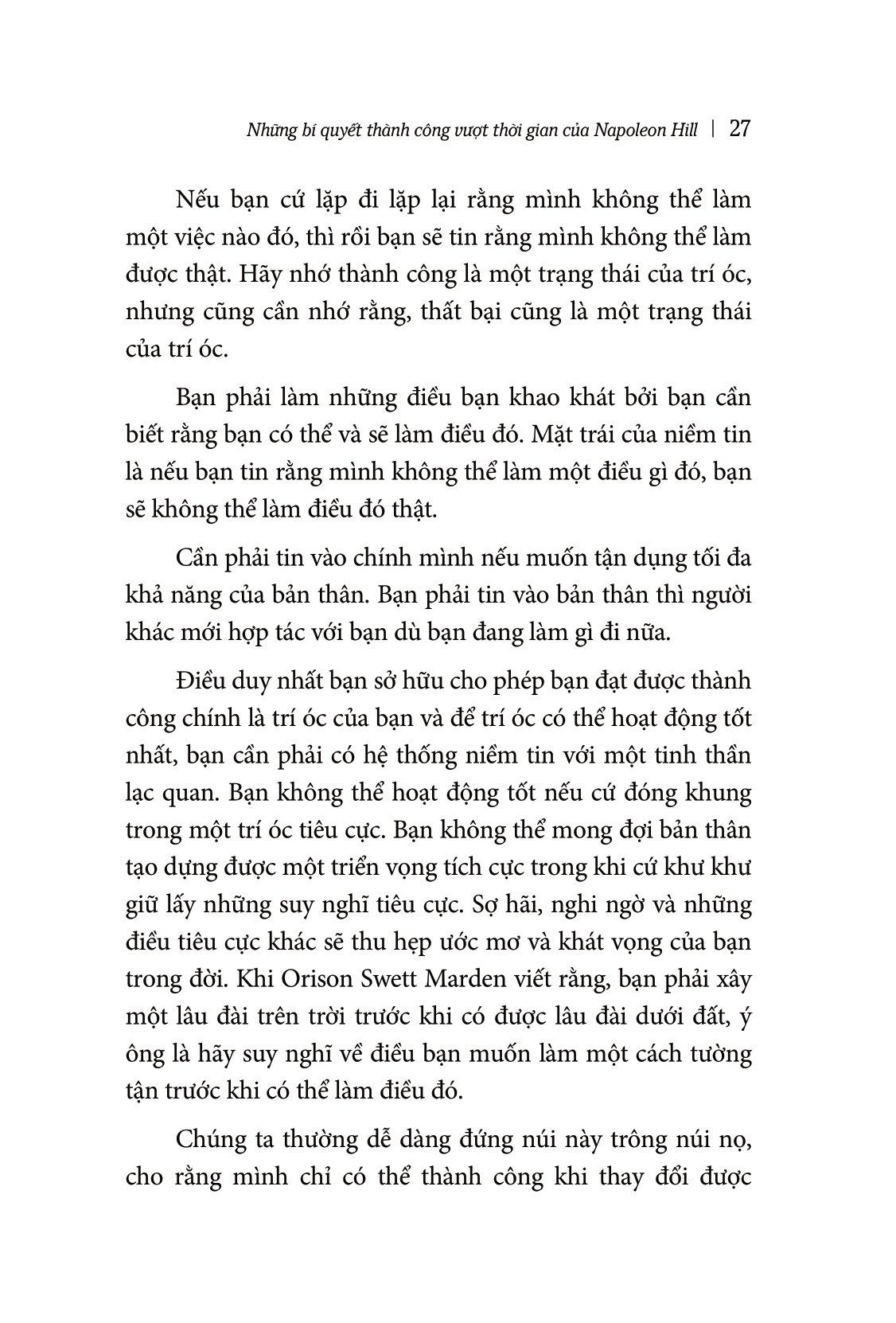 Niềm tin bên trong bạn là một sức mạnh nội tại có thể biến mọi việc từ không thể thành có thể. Bạn có thể làm bất cứ điều gì bạn nghĩ m.ình có thể làm. Niềm tin vào bản thân cho phép bạn kỳ vọng rằng bạn có thể giải quyết mọi vấn đề mà nhân loại đang đối mặt và làm được tất cả. Và tất cả những điều này được viết trong quyển sách “Những bí quyết vượt thành công vượt thời gian của Napoleon Hill.”