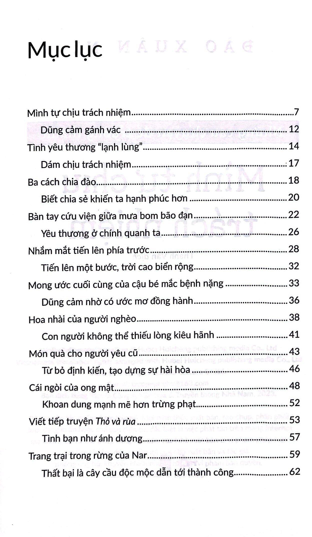 Mình tự chịu trách nhiệm gồm gần 30 câu chuyện sinh động về cuộc sống và tinh thần trách nhiệm. Biết gánh vác, chia sẻ, thể hiện yêu thương, vun đắp ước mơ, bỏ qua định kiến, khoan dung, vượt qua thất bại… là những bước nhỏ giúp bạn đọc có trách nhiệm với cuộc đời. Chịu trách nhiệm sẽ giúp mỗi người khỏe mạnh hơn, vững vàng hơn, đủ đầy hơn trong cuộc sống, và hỗ trợ được mọi người xung quanh.