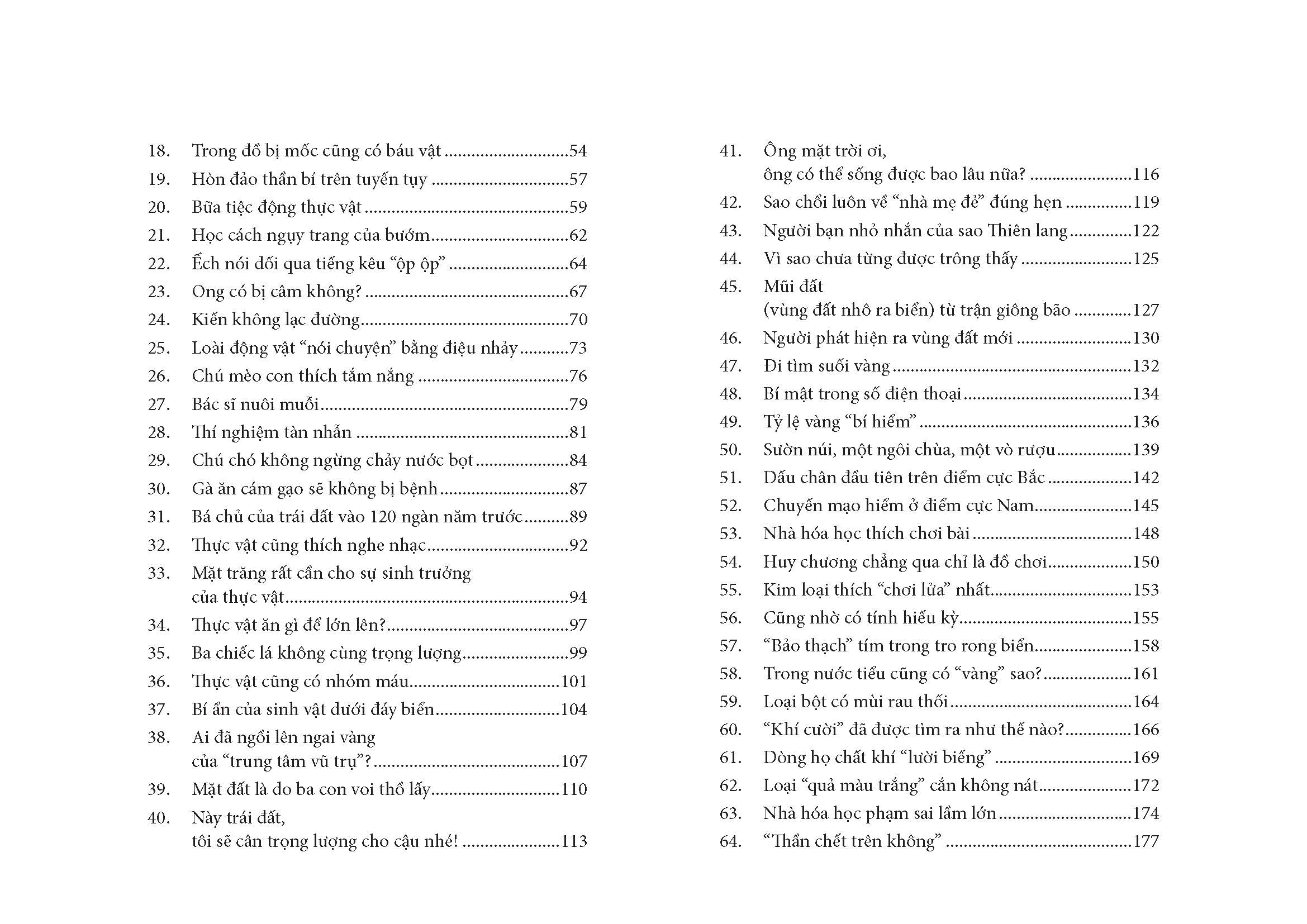Sách cung cấp các kiến thức về cuộc sống, sức khỏe, động vật, ẩm thực, cơ thể con người, giải trí, lịch sử, văn hóa, khoa học kỹ thuật, về thế giới…nhằm giúp chúng