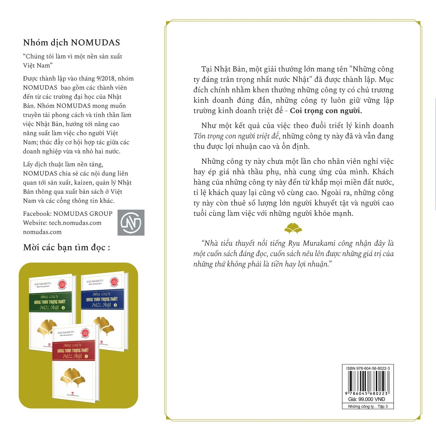 Để bày tỏ sự kính trọng, niềm ngưỡng mộ của mình với những công ty này ông viết bộ sách: “Những công ty đáng trân trọng nhất nước Nhật” và lựa chọn viết về khoảng 20 công ty trong hơn 6000 công ty ông đã khảo sát.