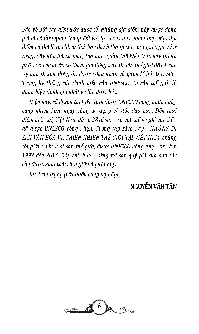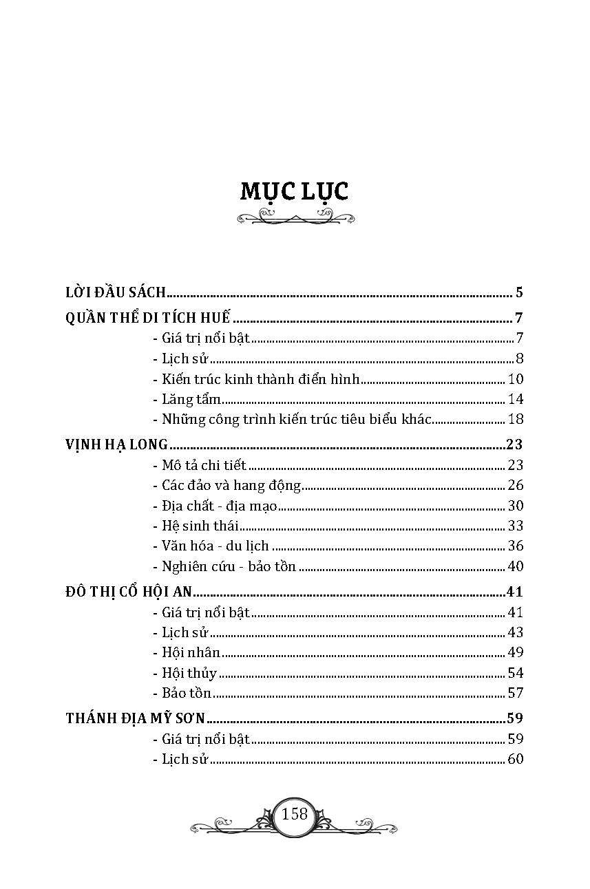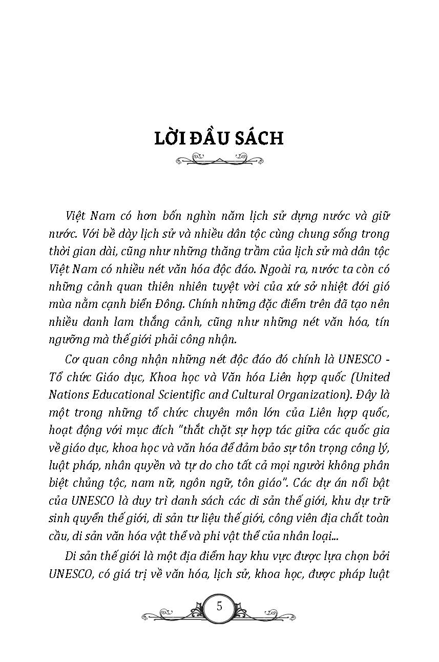 Mua tại TiktokGiới thiệu các giá trị nổi bật, lịch sử, kiến trúc điển hình và mô tả chi tiết về tám di sản thế giới tại Việt Nam được UNESCO công nhận từ năm 1993 đến 2014 mỗi di sản mang một vẻ đẹp và giá trị riêng biệt. Từ cố đô Huế với những kiến trúc cung đình nguy nga, đến vịnh Hạ Long với hàng ngàn hòn đảo đá vôi kỳ vĩ, hay phố cổ Hội An với những ngôi nhà cổ kính mang đậm dấu ấn giao thoa văn hóa, mỗi di sản đều là một câu chuyện lịch sử, một kiệt tác kiến trúc độc đáo, góp phần làm phong phú thêm kho tàng văn hóa của nhân loại.