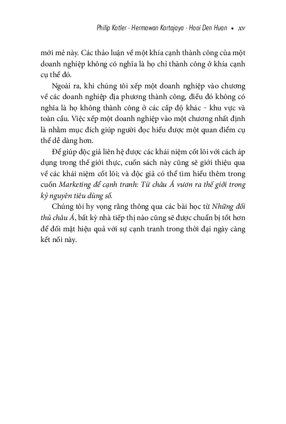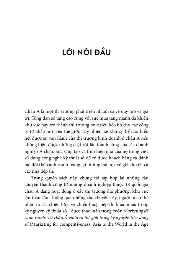 Môi trường bất ổn và biến đổi không ngừng ngày nay đang góp phần làm thay đổi bản chất của thị trường. Để các công ty có thể bắt kịp những sự thay đổi này, họ sẽ cần phải bắt tay vào làm Marketing Làn Sóng Mới để cưỡi lên những con sóng cơ hội mà những thay đổi môi trường đang tạo ra, chẳng hạn như cuộc cách mạng kỹ thuật số.Đây là một vấn đề lớn trên toàn thế giới, nhất là ở châu Á. Châu Á không chỉ là thị trường lớn nhất thế giới mà còn là thị trường phát triển nhanh nhất. Do đó, các nhà tiếp thị cần phải hiểu được sự vận động của các doanh nghiệp châu Á và những gì họ có thể mang lại cho thế giới rộng lớn hơn. Cuốn sách này phân tích các doanh nghiệp cạnh tranh từ 18 quốc gia châu Á đã thực hiện thành công Marketing Làn Sóng Mới, và qua đó cung cấp những bài học vô giá mà các doanh nghiệp khác có thể thấy hữu ích. Những trường hợp kinh doanh được nghiên cứu toàn diện ở đây không chỉ dùng để mô tả cách thức cạnh tranh của một số doanh nghiệp giỏi nhất châu Á, mà còn được dùng để phân tích làm rõ các khái niệm về Marketing Làn Sóng Mới đang làm nền tảng cho hành động của họ. Đây là quyển sách độc đáo về cả chiều sâu lẫn chiều rộng của các ví dụ thực tế, từ các doanh nghiệp trong khu vực ASEAN đến khu vực Đông Bắc Á, gồm cả Mông Cổ và những nước thuộc Hiệp hội Nam Á vì sự Hợp tác Khu vực (SAARC).Các tác giả của cuốn sách này, Giáo sư Philip Kotler, cha đẻ của ngành marketing hiện đại, Hermawan Kartajaya (Indonesia) và Hooi Den Huan (Singapore) đều là những chuyên gia trong lĩnh vực của mình và là tác giả của nhiều cuốn sách bán chạy khác. Những đối thủ châu Á, tập trung vào các ví dụ thực tế về các doanh nghiệp châu Á cạnh tranh trong thời đại số hóa, bổ sung làm rõ thêm cho những nguyên tắc và khung lý thuyết về Marketing Làn Sóng Mới đã được trình bày chi tiết trong cuốn Tiếp thị để cạnh tranh: Từ châu Á vươn ra Thế giới! (NXB Trẻ). Cùng với nhau, hai cuốn sách này vẽ nên bức tranh toàn cảnh về bối cảnh marketing châu Á đang không ngừng thay đổi.