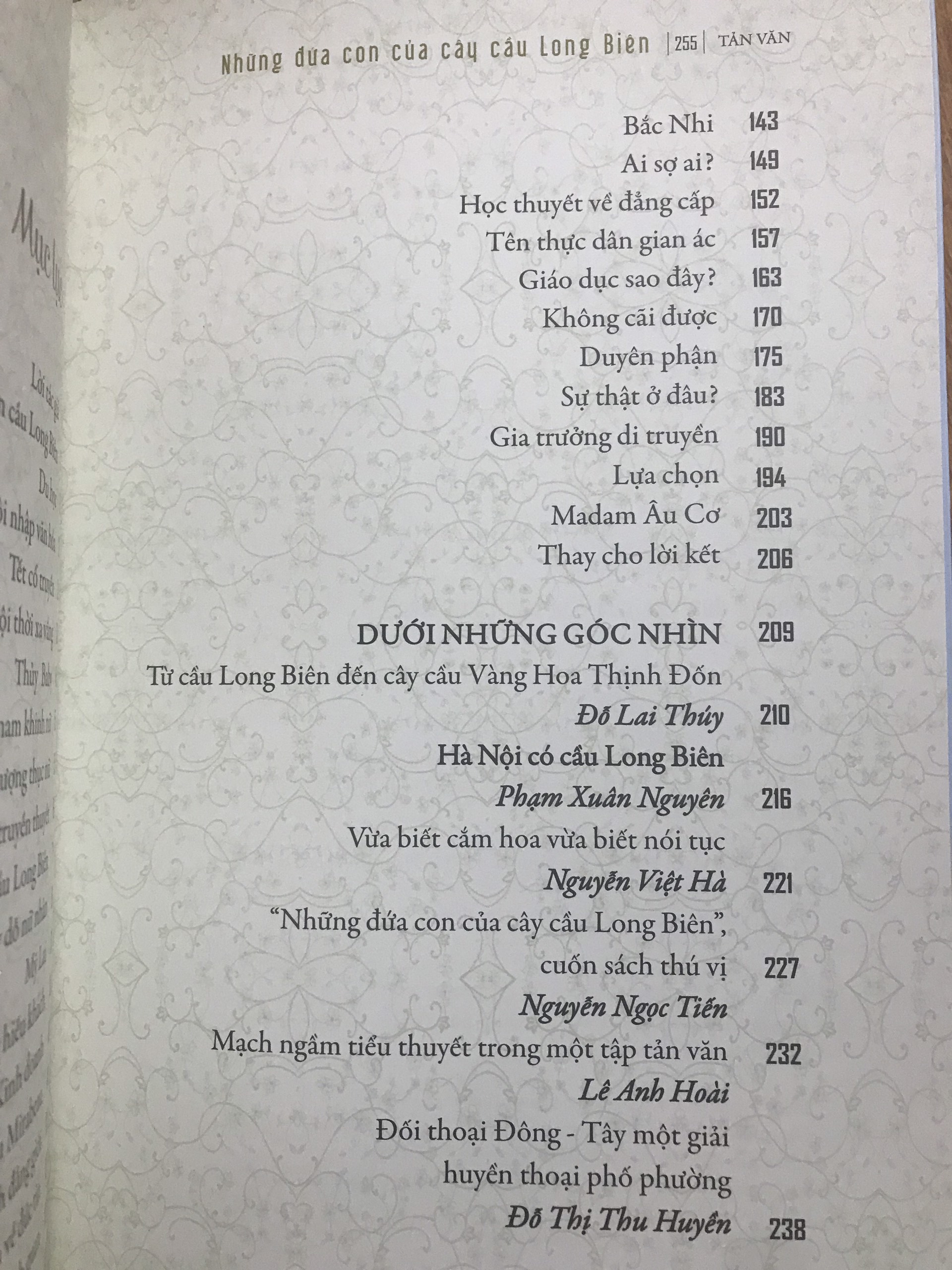 Cầu Long Biên là cây cầu nối hai bờ nam bắc sông Hồng, nội thành ngoại thành, và cũng đồng thời như một sự khơi dẫn cho những xúc cảm nối giữa quá khứ với hiện tại, Đông với Tây, cũng là điểm tựa để Đông Di đưa Tây Độc đến tìm về những mảnh vụn thị dân Hà Nội của những ngày sau Đổi mới. Những tản văn trong “Những đứa con của cây cầu Long Biên” cứ thế châu tuần, quấn quýt lấy cái trung tâm/điểm tựa kia, khi được kéo lùi về cả trăm năm, khi lại hiển hiện rõ ràng ngay trước mắt. Cây cầu Long Biên như một quy chuẩn để định vị, là khi gặp lại người bạn thời thơ ấu đã lớn lên cùng nhau, những buổi trưa la cà ở trên con phố Phan Đình Phùng nhặt quả sấu chín rụng.