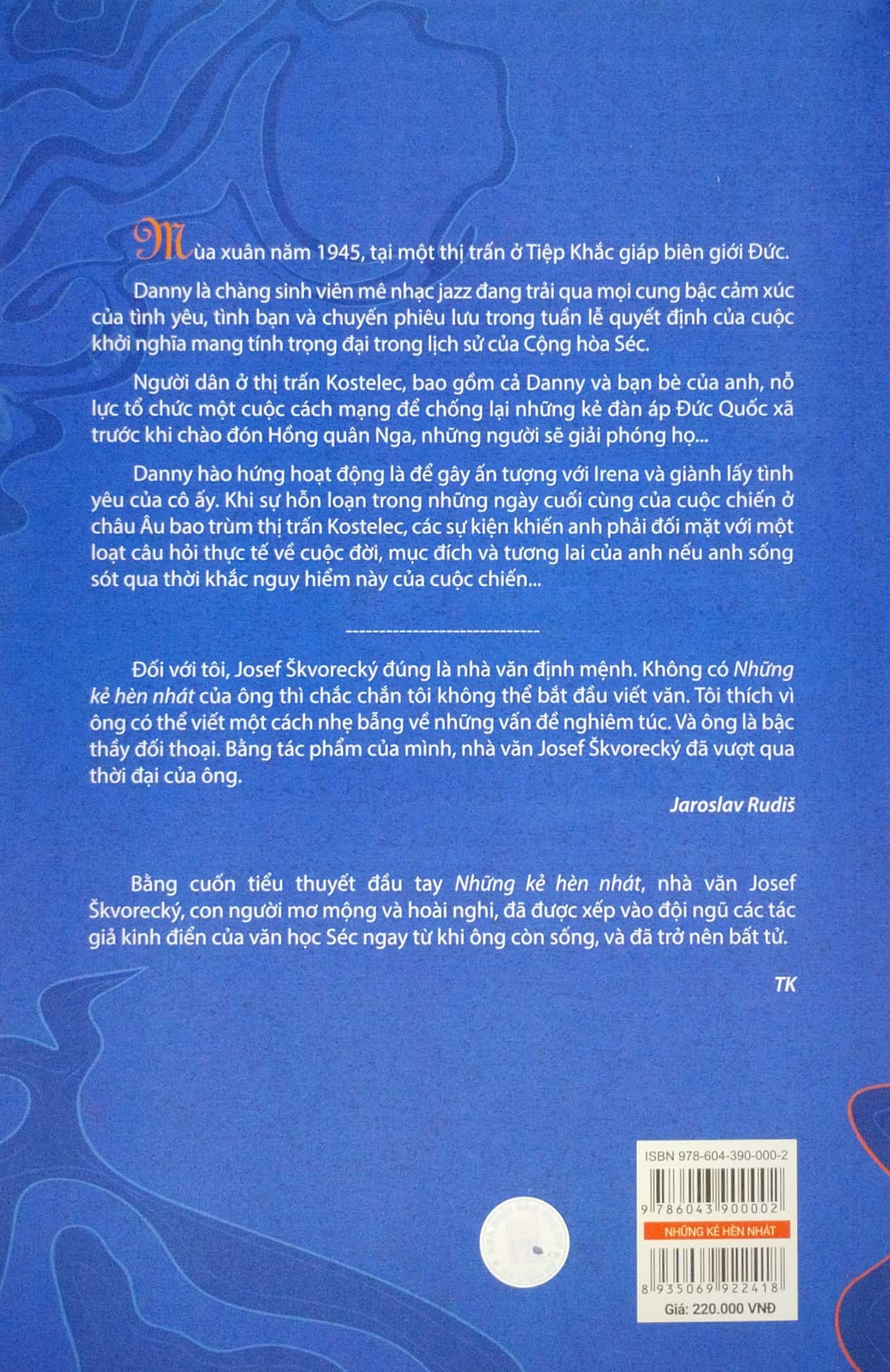 Gần như một cuốn tự truyện, Những kẻ hèn nhát của Josef Škvorecký viết về tám ngày cuối cùng (từ 4/5 đến 11/5/1945) của Đại chiến Thế giới II tại thị trấn nhỏ gần biên giới Séc - Đức mà tác giả đặt tên là Kostelec. Đầu tháng 5/1945, thủ đô Berlin bị Hồng quân Liên Xô đánh chiếm, Hitler đã tự sát nhưng tại Tiệp Khắc, quân Đức vẫn không chịu hạ vũ khí. Những người yêu nước Tiệp Khắc phát động cuộc khởi nghĩa nhưng bị quân Đức đàn áp nên đã kêu gọi Hồng quân giúp đỡ. Cả thị trấn xôn xao về tình hình chiến sự nhưng chàng sinh viên Danny chỉ có hai mối quan tâm thực sự, đó là phụ nữ và nhạc jazz. Phần lớn nội dung tác phẩm viết về sở thích chơi kèn sax của Danny và tình yêu của anh dành cho các cô gái, đặc biệt là nỗi khát khao Irena. Khi những người lãnh đạo Kostelec thành lập một lực lượng dân quân địa phương nhằm mục đích giữ gìn trật tự an ninh cho thị trấn, Danny và những người bạn trong ban nhạc của anh lại tỏ ra hoài nghi, thậm chí coi đó là trò hề. Khi bị buộc phải tham gia lực lượng quân sự và đi tuần tra quanh thành phố, Danny lại xem việc tham gia cách mạng và bắn súng là một cách hay để gây ấn tượng và giành lấy tình yêu của Irena. Những mộng tưởng xa vời của chàng sinh viên chỉ dừng lại khi những người tị nạn tràn vào thị trấn, quân Đức nổ súng cùng tình cảnh hỗn loạn trong những ngày cuối cùng của cuộc chiến ở châu Âu bao trùm Kostelec. Lúc này, anh phải đối mặt với những câu hỏi về cuộc đời, mục đích và tương lai của anh nếu anh sống sót qua thời khắc nguy hiểm của chiến tranh.