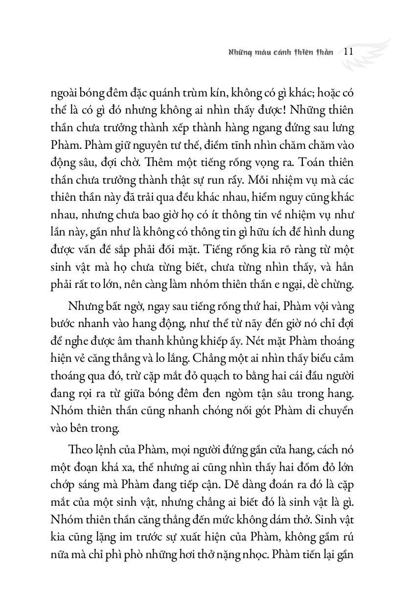Trên chiến trường ngổn ngang xác quỷ sứ, những thiên thần cũng đã nhuộm đỏ đôi cánh của mình. Nhưng quỷ sứ thì càng lúc lại càng đông lên, còn thiên thần thì mỗi lúc một thêm mệt mỏi. Trời đã về chiều, ánh mặt trời như máu loang dài trên khung cảnh chết chóc; tiếng gào rú, gầm gừ vẫn rúng động cả bầu trời.