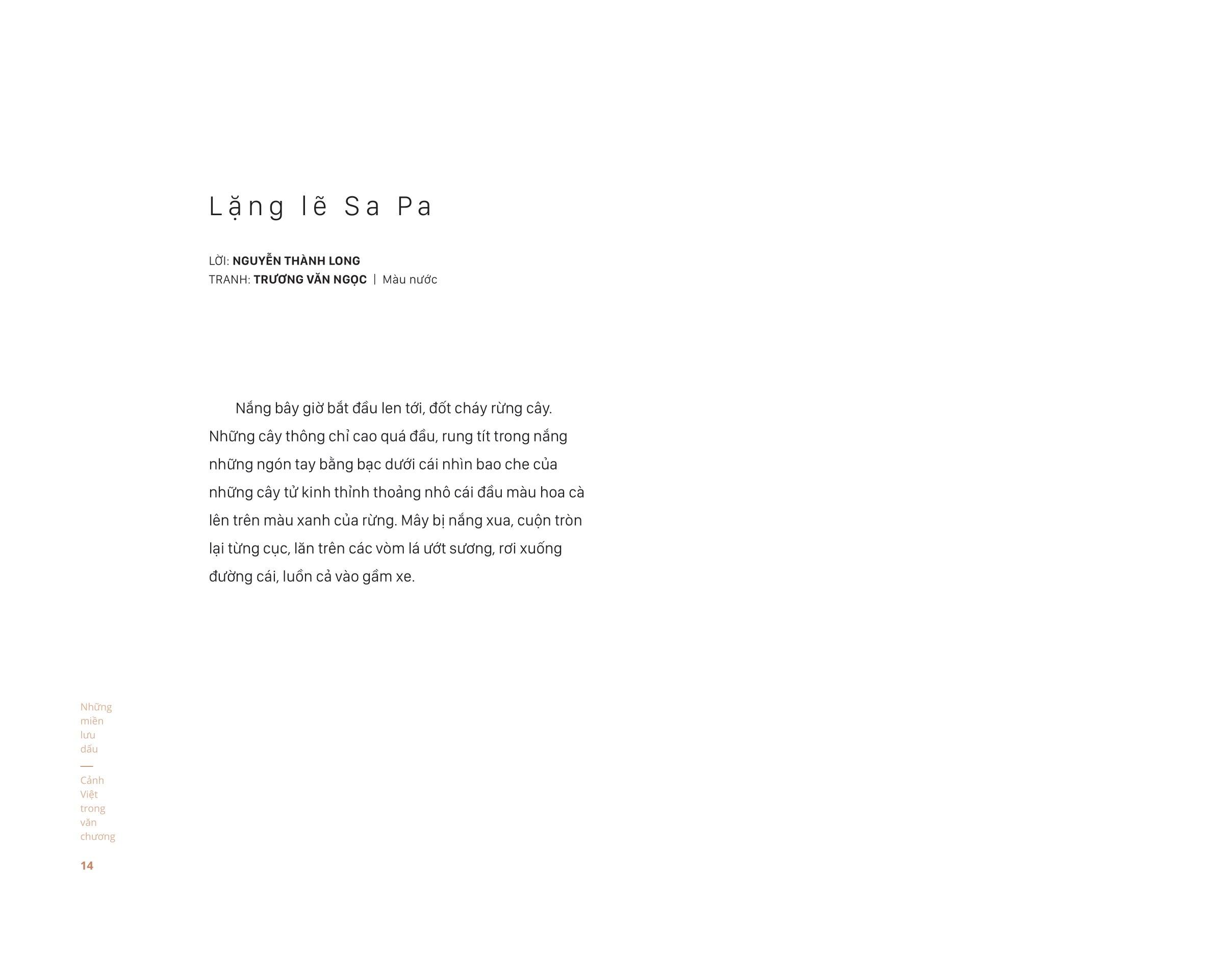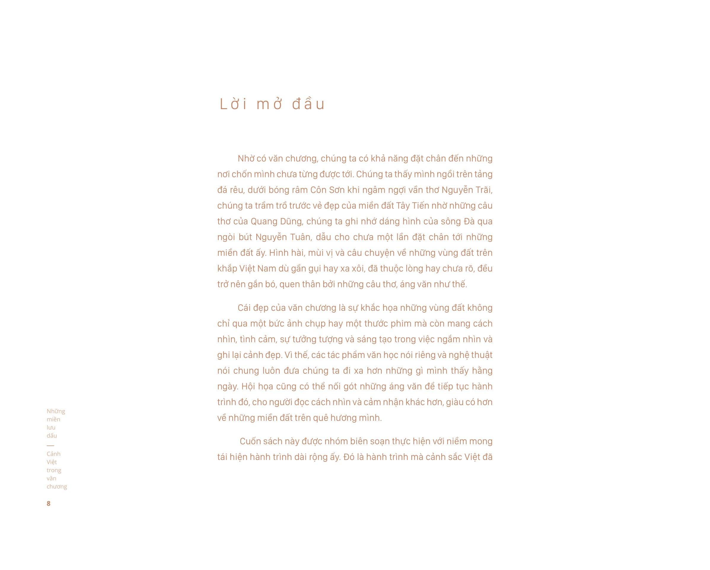 Mong rằng độc giả tận hưởng cuốn sách này với cảm giác thân thuộc và cả ngạc nhiên về cảnh sắc những miền đất quê hương trong văn chương Việt Nam.”